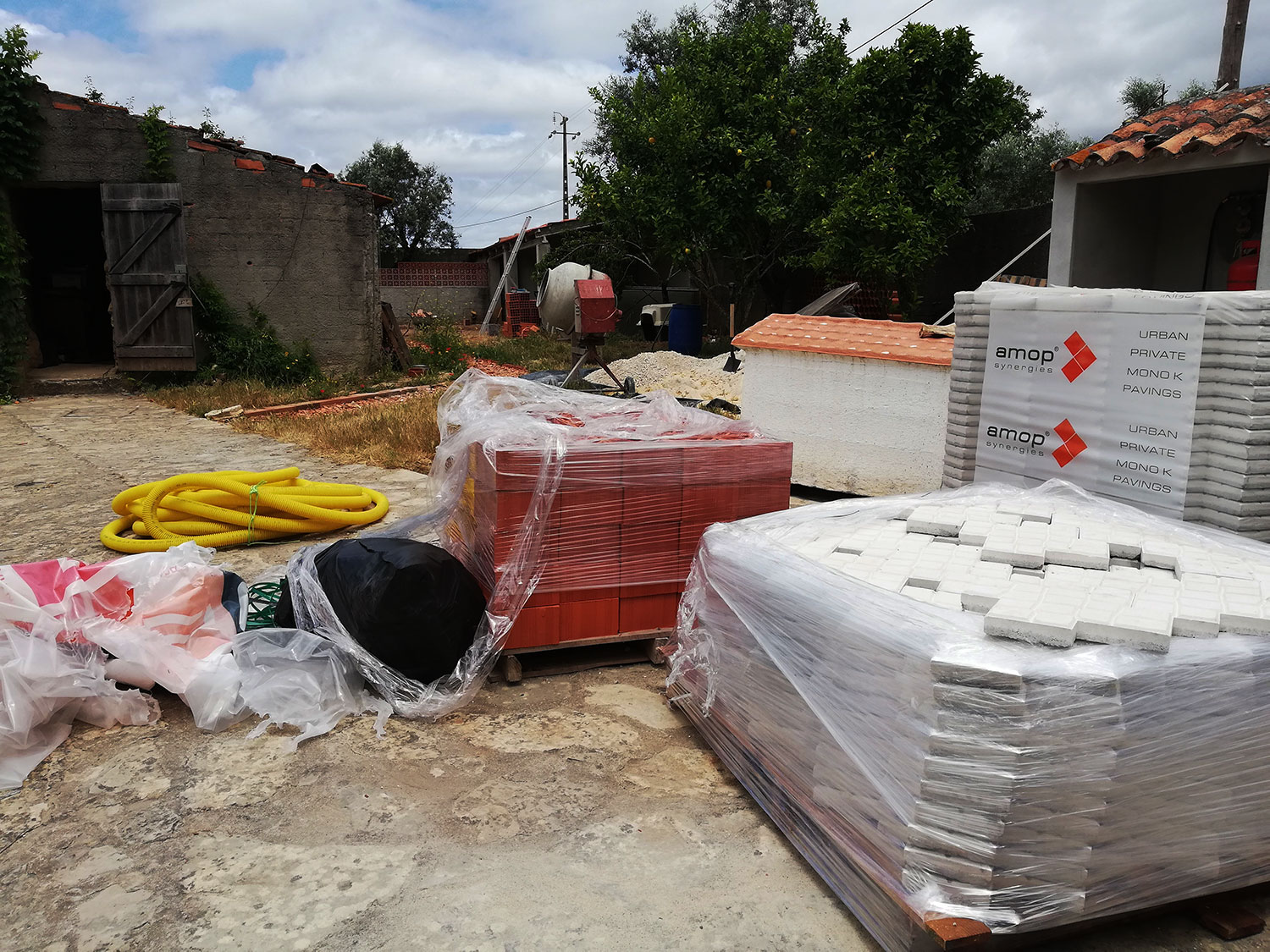 Het pleintje voor het oude huis lijkt inmiddels wel een bouwplaats. Een cementmolen staat de hele dag te draaien, dakpannen liggen in pallets opgestapeld, naast tegels voor de terrasvloer en de terracotta stenen met bloemmotief. Er ligt een hoop zand en grind. Kruiwagens met afgegraven grond worden weggereden, en je hoort ondertussen het getik op stenen van een metselaar. Het is een en al bedrijvigheid. Gelukkig is de regen opgehouden en kan er weer doorgewerkt worden.