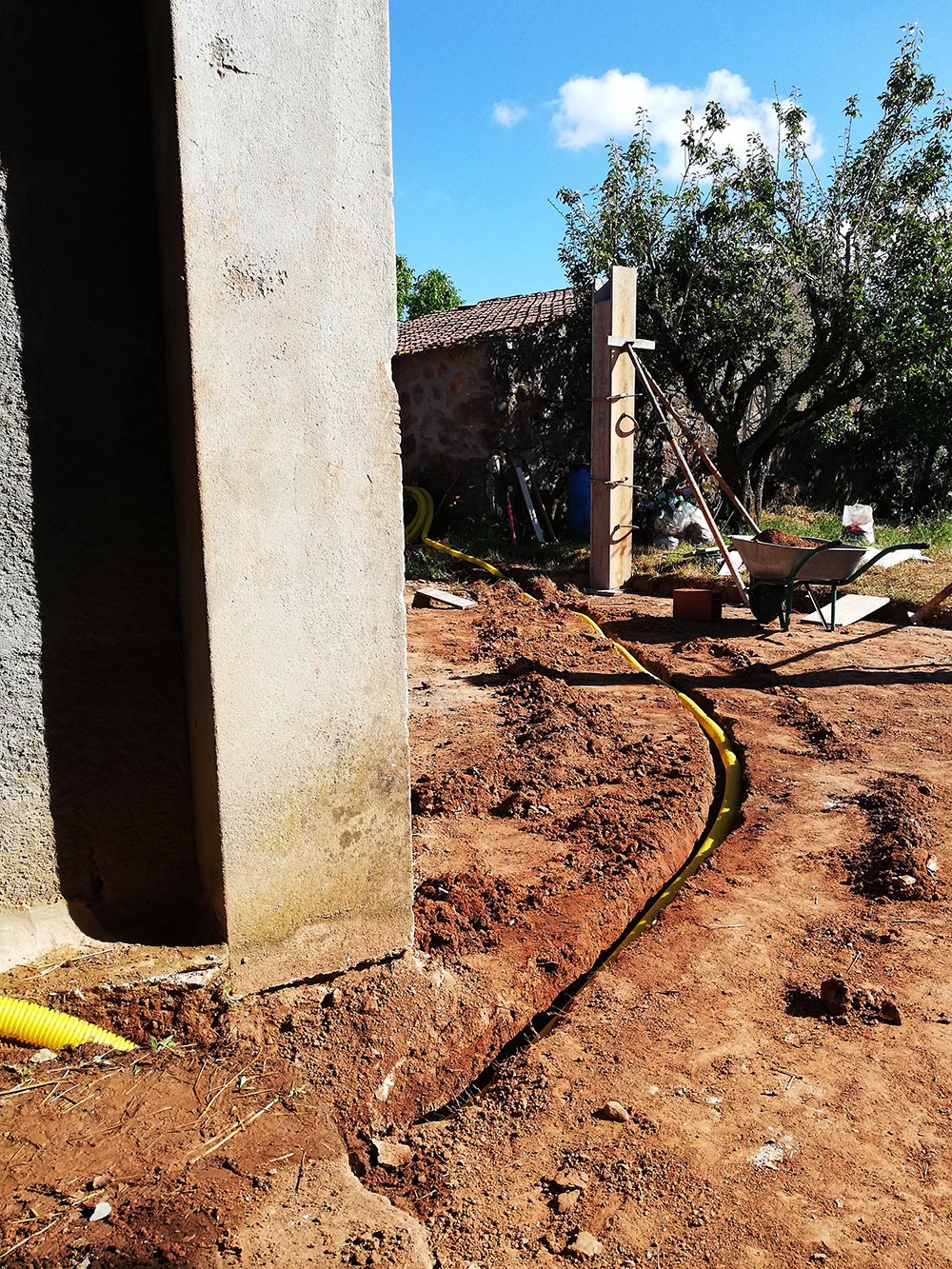 Onder het afdak gaan we een buitenkeuken maken. Daar willen we natuurlijk elektriciteit hebben. Ook in de stal en in de opbergruimte is het handig als we een stopcontact hebben en als we een lamp kunnen aanzetten. Onder het terras door moet dus een kabel komen, Hoe we dat precies gaan aansluiten weten we nog niet precies. In ieder geval moet de stroom uit het oude huis komen, waar we al stopcontacten en verlichting hebben. Onder de vloer van het terras hebben we daarom een geul gegraven en hierin een mantel gelegd. Aan weerskanten een flink stuk extra, omdat we nog niet precies weten waar het heen moet gaan.