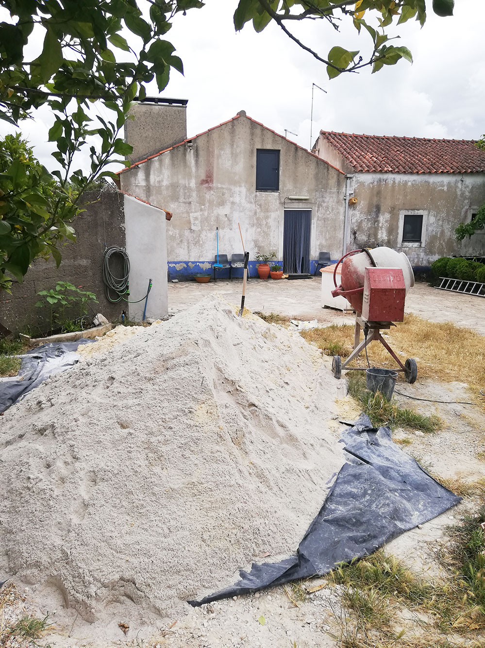 De mannen zijn nu achter bezig en dat neemt nogal wat troep met zich mee. Als we die muur laten doen hoeven ze daarna nooit meer daarachter bezig te zijn. Op die manier werken we van achter naar voren. We kunnen dan als ze klaar zijn het terrein opruimen en opschonen zonder dat er nog een keer met cement, puin, kruiwagens en wat al niet meer gewerkt hoeft te worden. Die beslissing betekent wel dat er nog meer zand nodig is, dus de krimpende berg wordt nu voor de tweede keer aangevuld. De eerste keer omdat we bloembakken, een buitenbed en een extra muurtje wilden en nu dus het afsmeren.