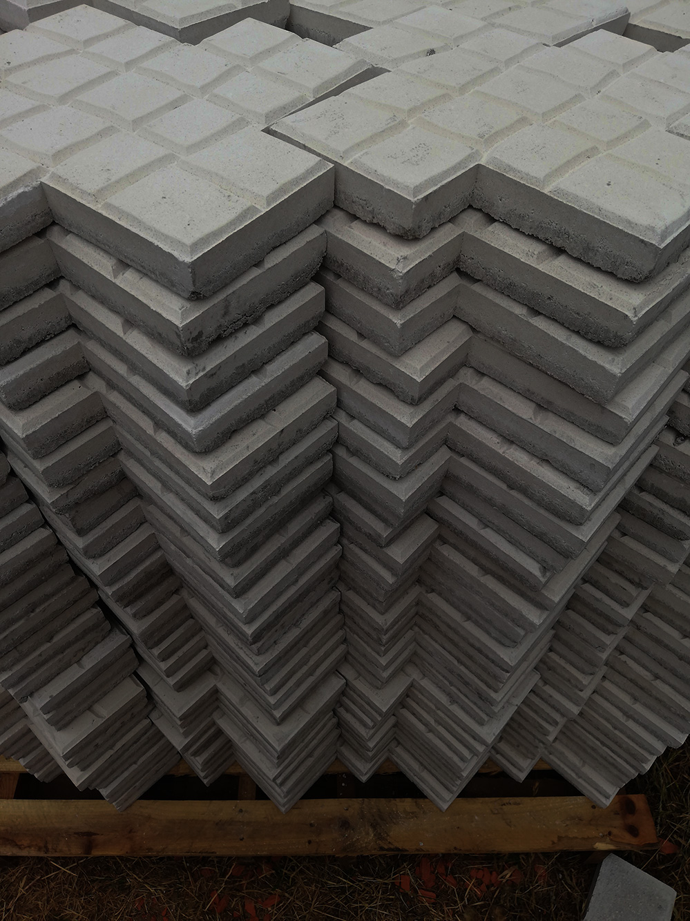Ons terras krijgt dezelfde uitstraling. Omdat het een aardige oppervlakte is hebben we ook aardig wat tegels nodig. Ze staan nu opgestapeld in lagen van zestien stuks.