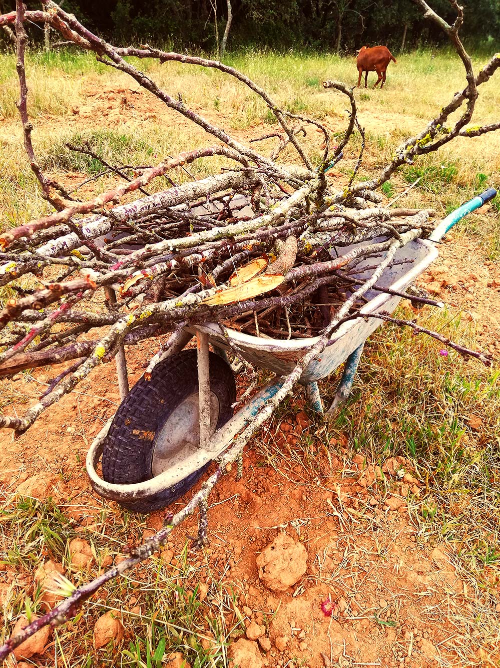 De takken liggen her en der verspreid op het terrein. Als we gesnoeid hebben leggen we ze bij Lurdes Maria die het voorwerk doet: ze eet de blaadjes eraf en hier en daar de bast. Dan hoeven wij ze alleen nog maar te verzamelen, te vervoeren en op maat te maken.