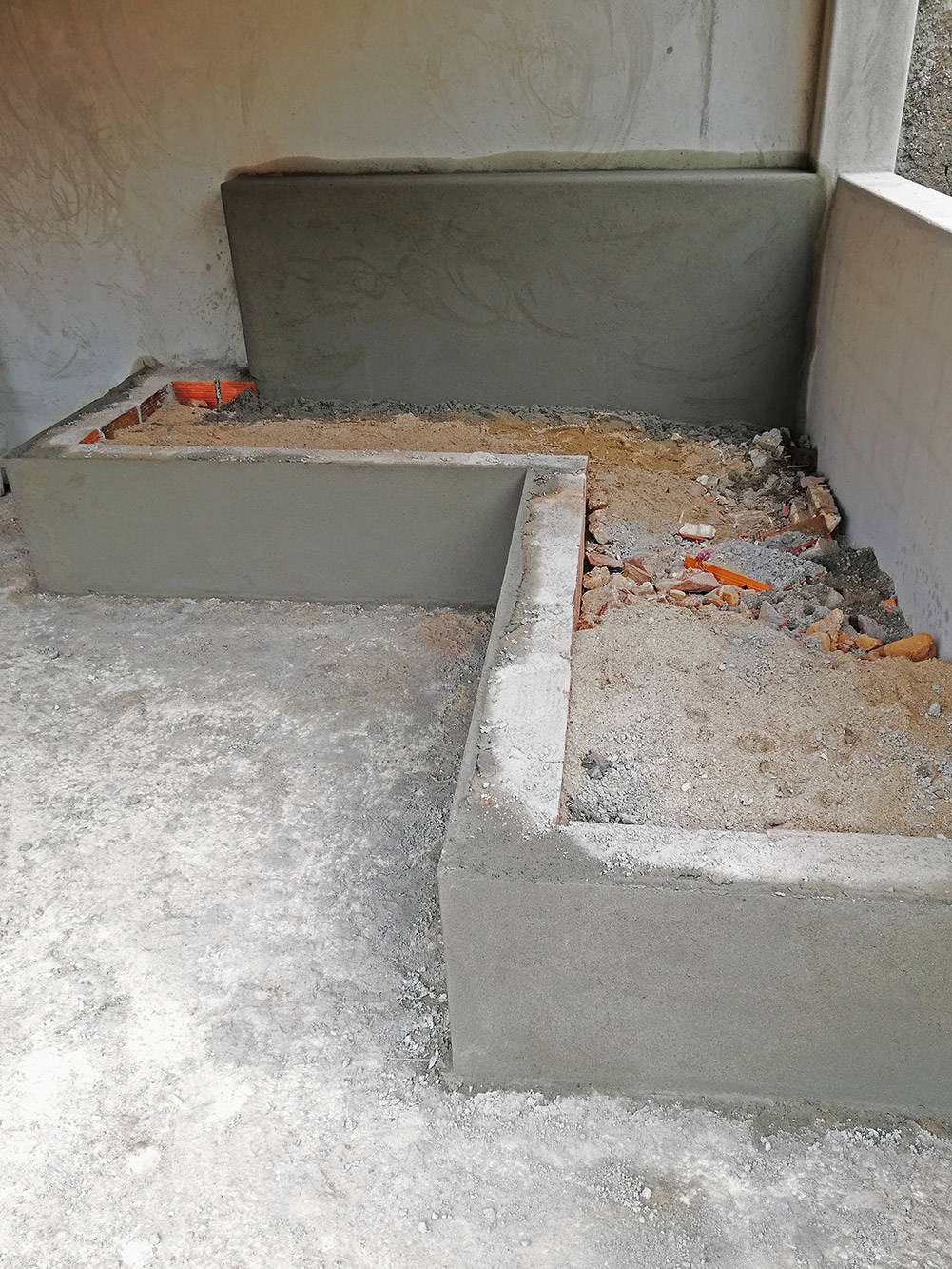 Onder het afdak (de alpendre heet het hier, een woord dat je makkelijk overneemt, het klinkt ook een stuk sjieker) komt het buitenbed. Het is de bedoeling dat we hier straks kunnen zitten of liggen. Het is eigenlijk een grote bak die we vullen met het puin dat we hier en daar op het terrein vinden. Het puin komt ondermeer van de muur die aan de andere kant opengebroken is om de openslaande deuren te kunnen maken. En natuurlijk wat er al her en der op terrein lag. We hadden al een grote verzameling dakpanscherven die we in het pad gelegd hadden, maar op het terrein vind je ook stukken beton van niet afgemaakte projecten. Dat kunnen we nu mooi in deze bak dumpen, samen met restanten zand waar we niets mee kunnen. Wéér gesleep met kruiwagens. Allemaal voor het hogere doel moet je maar denken!