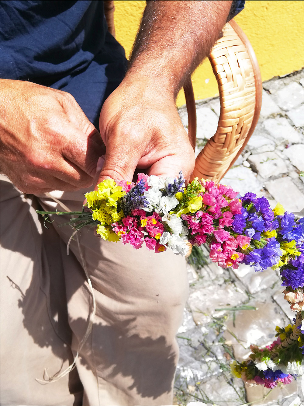 Óbidos is de stad van boeken, ginja en bloemen. Op straat is een man bloemenkransen aan het vlechten. In alle kleuren en maten in de mooiste combinaties. Merel is er zo opgetogen over, dat ze een krans kocht.