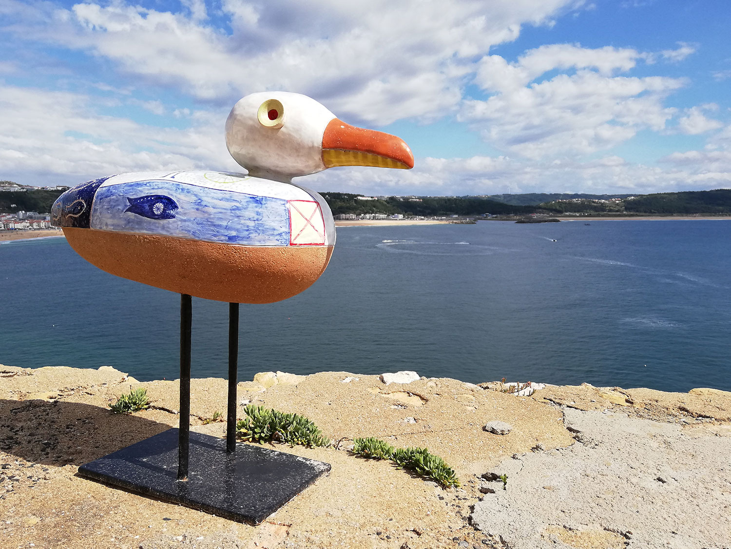 In de ochtend slecht weer. Zes uur lang binnen gezeten en gepuzzeld, een ware marathon! In de middag begon het op te klaren en daarom zijn we eropuit gegaan, naar Nazaré, een stad aan de kust op een dik half uur rijden. Nazaré staat bekend om de hoge golven, zoek op YouTube maar eens op ‘Nazaré’ en je vindt spectaculaire filmpjes van surfers. Er komen golven voor van over de dertig meter. Begin 2018 is het wereldrecord hoogste-golfsurfen gevestigd op 35 meter. Het is daarom niet voor niets een surfparadijs; er is zelfs een surfmuseum. Toen wij er waren was op het fort en bij de vuurtoren een kunstmanifestatie, vandaar deze prachtige meeuw.