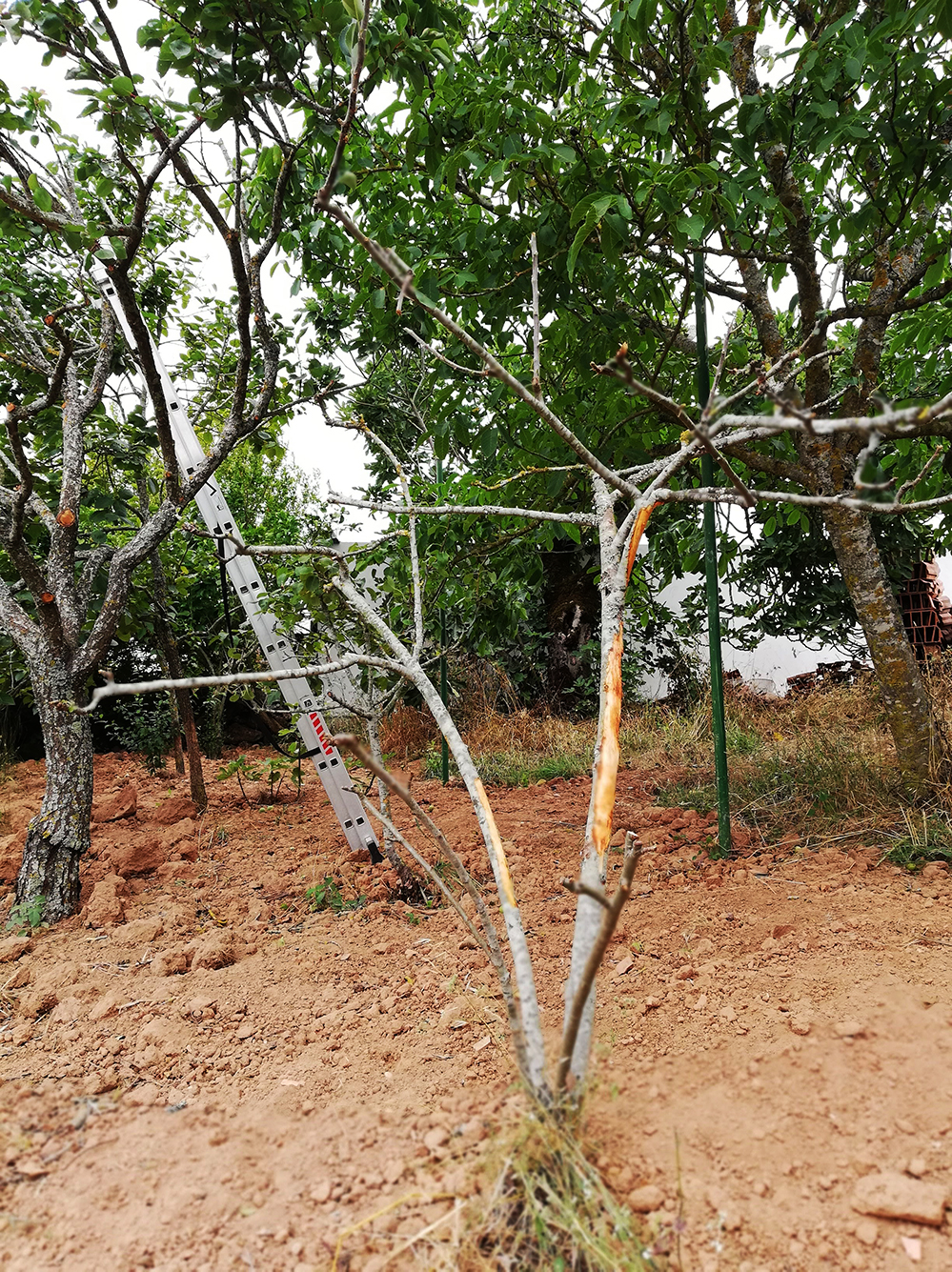 Vannacht is Lourdes Maria ‘ontsnapt’. Ze is niet weg hoor, maar op een of andere manier heeft ze de musketonhaak losgekregen en is over het terrein gaan zwerven. Onze appeloogst is weg. We hadden wel vier kleine Jonagold appeltjes. We hadden ook een klein pruimenboompje, met één donkerrode pruim. Die pruim is weg net als alle blaadjes van de boom. Ze heeft zichzelf vastgedraaid aan dit boompje, de musketonhaak is ergens achter blijven hangen en ze heeft waarschijnlijk een voorkeursrichting als ze om de boom heen draait, want de ketting zat er wel tien keer omheen gedraaid. Zo heeft ze wel de kans gehad het boompje van alle kanten te bekijken: alle bladeren en jonge twijgen zijn eraf. Gelukkig maar dat ze zich vastgedraaid had anders waren de andere bomen misschien ook kaalgevreten.