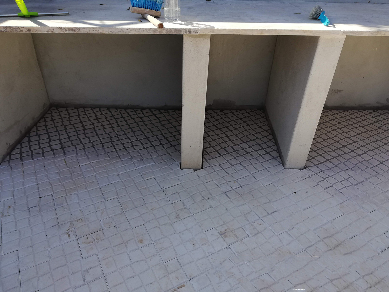 Je kunt het voegen ook niet doen terwijl de zon schijnt, het is te fel en te warm en het voegsel droogt te snel. Morgen gaan we kijken hoe het resultaat is. Voor de zekerheid hebben we alleen het gedeelte nog gedaan dat straks in de kast zit, als het dan tegenvalt dan zie je het tenminste niet zo. Vooralsnog hebben we goede hoop en gaan we morgen serieus aan het werk!