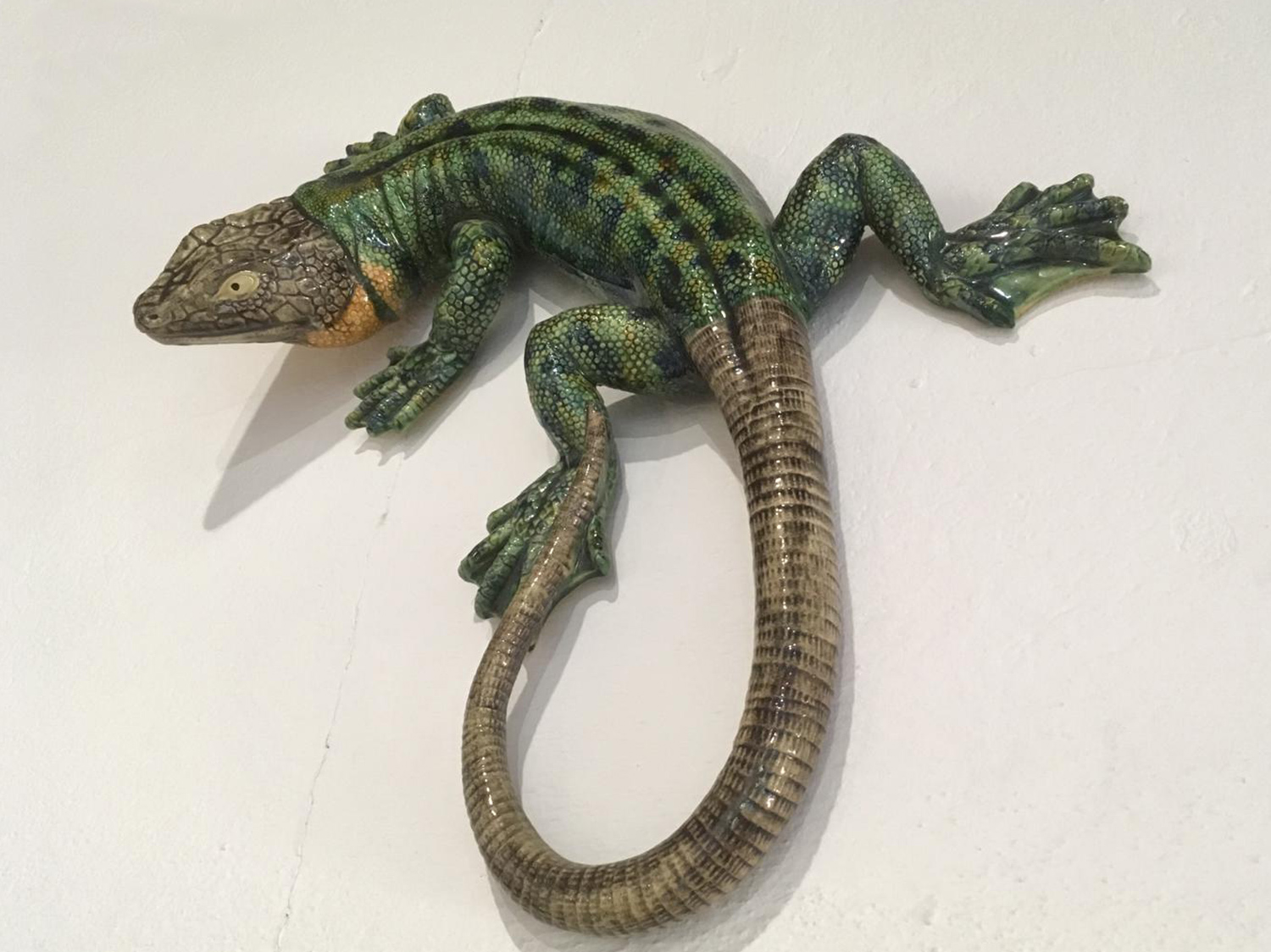 Geen schilderwerk vandaag en geen voegwerk. Met Jan, onze vrijwilliger, naar het museum voor keramiek in Caldas da Rainha geweest. Het meeste keramiek dat je daar ziet is van Bordallo Pinheiro. Die leefde rond de vorige eeuwwisseling en de man was naast van alles en nog wat een begenadigd keramist. Fantastisch mooie dingen kun je er zien, sommige levensecht. Vissen op een schaal, vazen waarvan de handvatten slangen zijn. Vazen met een keramieken net eromheen waaruit vissen ontsnappen. Het dier op de foto is levensgroot en hangt ergens aan de wand. Het is af en toe echt adembenemend. En het gebouw op zich is de moeite waard. Het is de villa van een keramiekverzamelaar, de keuken is betegeld met oude delftsblauwe tegeltjes, en verder zijn bijna alle wanden betegeld. Buiten staan grote bloembakken die ook betegeld zijn. Mocht je ooit in Caldas komen, dan is dit museum zeker de moeite waard.