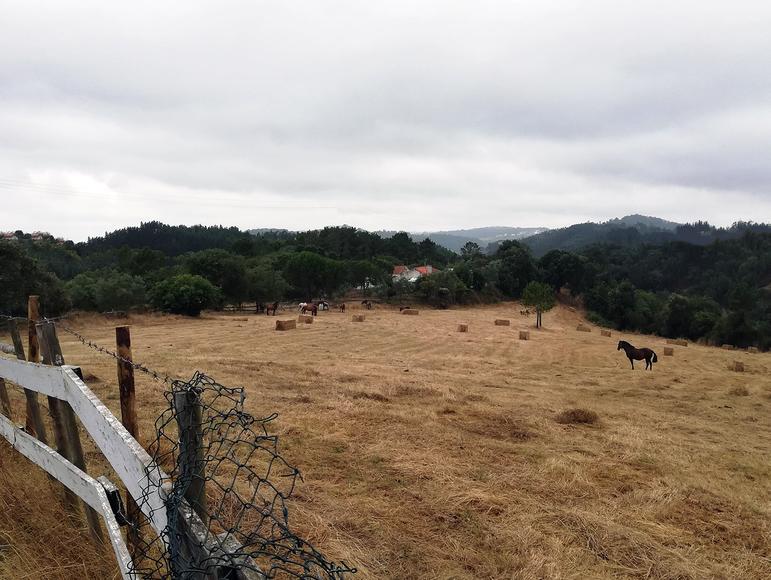 Nu de paarden weer terug zijn ziet het er allemaal lekker landelijk uit. De bomen zijn prachtig groen, de velden zijn gelig van het stro dat er ligt. Zo is het net of onze Quinta is verborgen in het bos en de weilanden. Dat is niet zo maar vanuit ons huis moet je moeite doen om het huis van de buurman te zien, meestal is het verscholen achter de bomen langs het weggetje. En de buurvrouw aan de andere kant, Dona Conceição, is al helemaal niet te zien doordat het huis in een dal ligt. De huizen van Casal da Marinha kun je zien aan de overkant van het dal, als je bij het stalletje staat, vanaf andere plekken van het terrein is het verborgen achter de kurkeiken.