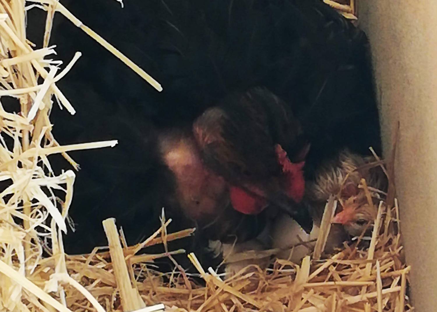 Ja hoor! Het is gebeurd. Het eerste kuikentje is vandaag geboren. In eerste instantie hoorden we alleen gepiep, en kon je nog niks zien. Mortícia hield het kuikentje angstvallig verborgen. Maar als je dan even rustig blijft staan komt het kuikentje toch tevoorschijn, een hoop kabaal en steeds maar zoeken naar de warmte van moeders vleugels.