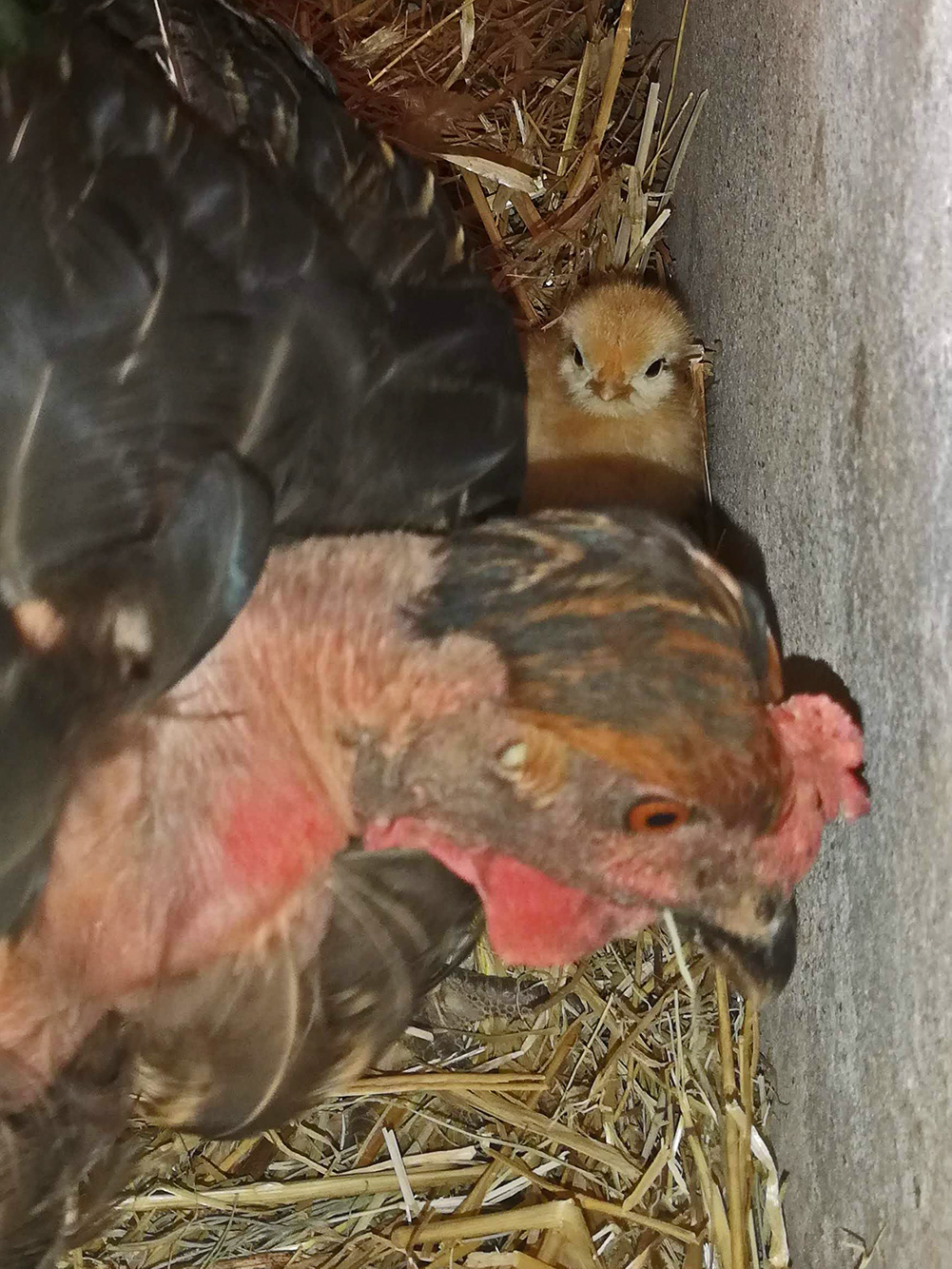 Het kuikentje is nu twee dagen oud en begint zich te laten zien. Als we een beetje voer in de buurt van het nest strooien komt Mortícia er direct op af en Wednesday komt erachteraan. Piepend en al. Hij pikt op deze manier ook een graantje mee, Mortícia laat zien wat wel en wat niet te eten. Als Mortícia even van het nest is kunnen we zien dat er nog steeds dertien eieren liggen. Pinóquia en Branca de Neve zijn nu ook weer aan het leggen, en we moeten goed opletten want ze leggen allebei naast Mortícia’s nest, als we dan de eieren niet weghalen, rolt Mortícia ze in haar nest en kunnen we niet meer zien welke van haar zijn en welke niet. Dus kunnen we ook niet meer zien welke eieren bebroed moeten worden. Voorlopig kunnen we lekker kijken naar het gescharrel van Wednesday en kijken we vol verwachting uit naar misschien wel een broertje of zusje.