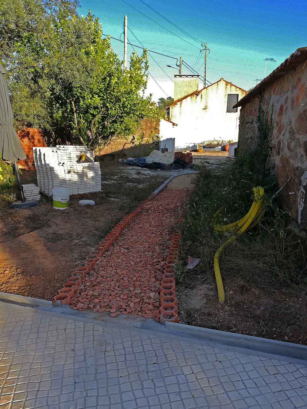 In februari hebben we een flink stuk aangelegd (met hulp van Arthur!) en nu het laatste stukje. Het was natuurlijk wachten op het terras totdat dat af was, en nu we de goot langs het terras hebben gemaakt, kunnen we eindelijk het pad aansluiten. Dat betekent nog een stuk of vier van de wijnrekstenen in de grond en aanvullen met dakpanscherven. Van die scherven hebben we nog steeds genoeg! Elke keer als we een stukje grond willen afgraven komen we weer een hele bulk tegen. Inmiddels emmers vol en een paar puinzakken. We moeten nog een heel stuk pad aanleggen, dus het komt mooi van pas. Binnenkort gaan we spul bestellen dat op de scherven komt te liggen en het pad een beetje compact maakt.