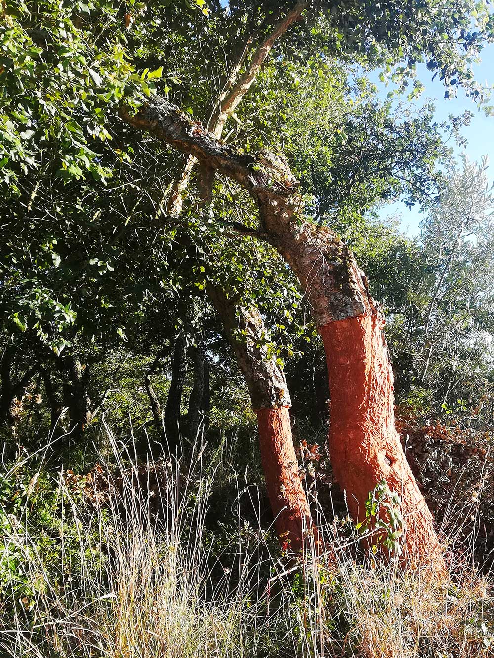 Het is kennelijk weer het seizoen, als er al van seizoenen sprake is met kurk. Langs het weggetje is een stukje grond dat eigenlijk niet bijgehouden wordt. Van gemeentewege wordt een strook in de berm twee keer per jaar gemaaid, maar verder gebeurt er niks. Ideale plek voor konijnen, egels, eekhoorns en zo, dus Max en Karma snuffelen er altijd naar hartenlust. Xarique snuffelt sowieso altijd de hele weg, voor hem maakt dat stuk niet zo veel verschil. Het lijkt erop dat er toch een eigenaar is van het stukje grond die zich er een beetje om bekommert, want een paar kurkeiken zijn pas ontdaan van hun bast. Er wordt dus geoogst. We zien nooit iemand op dit stukje en we weten dus ook niet van wie het is, we zien alleen dat er kurk verdwijnt. Of zouden we kurkdieven hebben?
