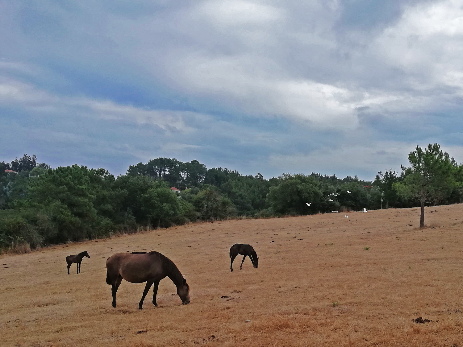 Aan de overkant van de weg zijn de witte reigers gearriveerd. In de zomer zijn ze altijd weg en tegen het eind van de zomer komen ze weer terug en zitten dan bij de paarden, waarschijnlijk vinden ze van alles in de buurt waar de paarden grazen. In het zuiden, in de Algarve, is de terugkeer van de witte reigers het teken dat de regentijd gaat beginnen. In de Algarve is dat een heel ding want de hele zomer valt er helemaal niets. Hier in het midden van Portugal is dat anders, ook in de zomer zijn er soms dikke buien die een avond aan kunnen houden. Daar hebben wij de laatste tijd geen last van, het heeft ook hier allang niet geregend, op een klein buitje vorige week na, dat eigenlijk geen naam mag hebben. Ook de komende dagen ligt er geen regen in het verschiet, heerlijk zomerweer, overdag rond de dertig graden en ’s nachts koelt het af tot zeventien of achttien.