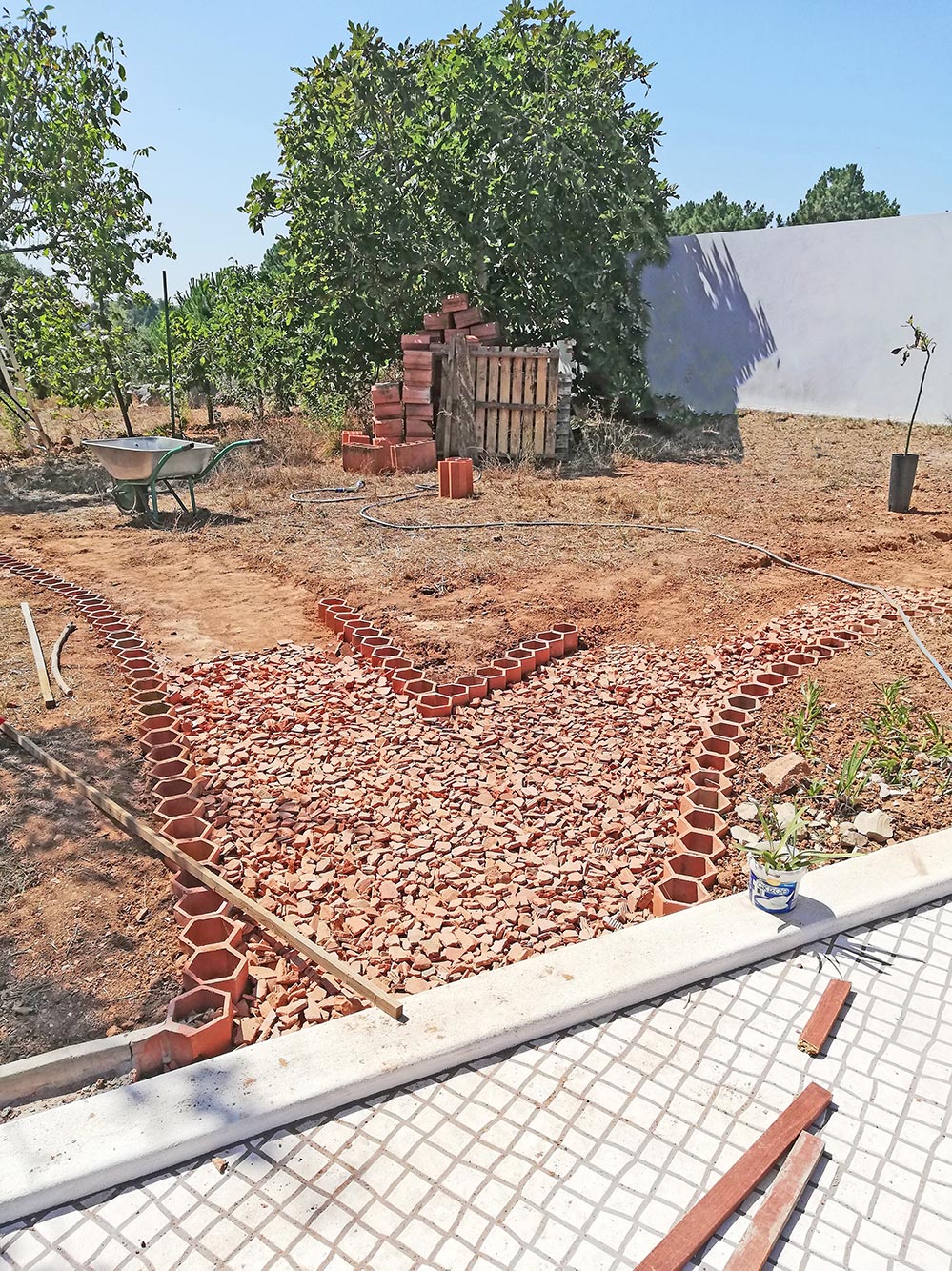 Doordat het internet een tijdje eruit gelegen heeft, hebben we even wat achterstand in te halen. Dus helaas een paar meldingen achter elkaar. Hoe dan ook, we hebben vooruitgang gemaakt met de splitsing van het pad, bij het terras. Doordat Jordyn, onze vrijwilligster, er zo veel werk aan gehad heeft, noemen we het voorlopig Cruz da Jordyn. We schieten nu zo hard op dat we door onze voorraad scherven dreigen te raken. Er ligt nog genoeg in het land verborgen, maar wat we de afgelopen tijd verzameld hebben begint nu aardig op te raken. We gebruiken de grond die vrijkomt bij het aanleggen van het pad, om de afstap een stukje verder weg te halen, opdat daar later onze vouwwagen doorheen kan. Er is nog een hoop af te graven, maar we komen er wel!