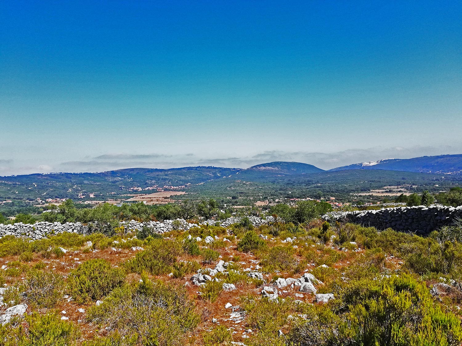 Geen gedoe met paden vandaag, maar wandelen in het natuurgebied Os Candeeiros. We wonen er zo ongeveer tegenaan, het is een rit van elf kilometer naar het begin van het wandelpunt. De rit op zich is al zeker de moeite waard. Het stuk over de IC2 is niet zo, veel vrachtwagencafés en steenverkopers. Maar zodra je rechtsaf gaat, de bergen in, kom je meteen in een andere wereld. Kronkelweggetjes, kleine dorpjes en heel veel muren van gestapelde stenen, alsof je in Wales bent of zo. We hebben een prachtige wandeling gedaan met zijn drieën. Wij tweeën en Jordyn onze vrijwilligster. Onderweg heb je fantastische uitzichten, je loopt zo’n beetje over het hoogste punt van de bergketen. Het gaat stukken over een karrenspoor van kleine steentjes en stukken over alleen voetpad, waar je goed moet uitkijken waar je je voeten neerzet, zo veel stenen steken er omhoog uit het pad. Veel bramen zie je onderweg, erg klein maar goed van smaak. De wandeling is circulair, je komt precies uit bij het punt waar je begonnen bent.