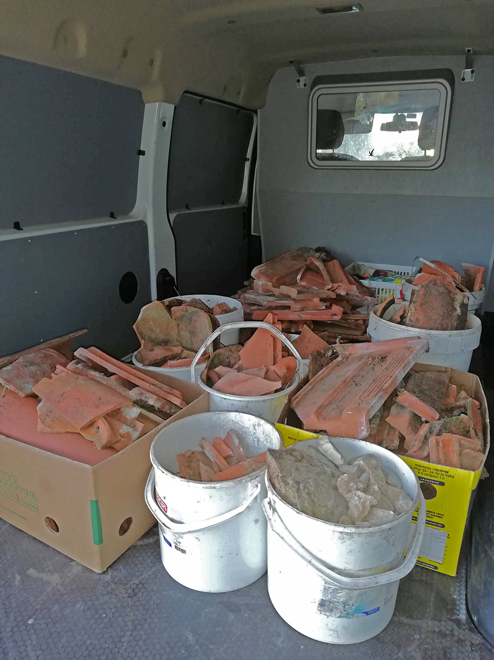In ons geval komt het goed uit, want we zijn door de scherven heen. Jordyn, onze vrijwilligster, heeft zo goed geholpen dat het pad een stuk langer is geworden en op de splitsing hebben we ook nogal wat scherven nodig. In het land ligt hier en daar nog wat, maar dat wordt langzamerhand een druppel op de gloeiende plaat. Met de kapotte pannen uit het bos van Anita zijn we dus blij. We hebben het busje volgezet met voldoende voorraad voorlopig. Het is triest, maar we hebben nog geen kwart weggehaald dat er lag. Misschien komen we later terug als we door de voorraad heen zijn. Voorlopig genoeg!