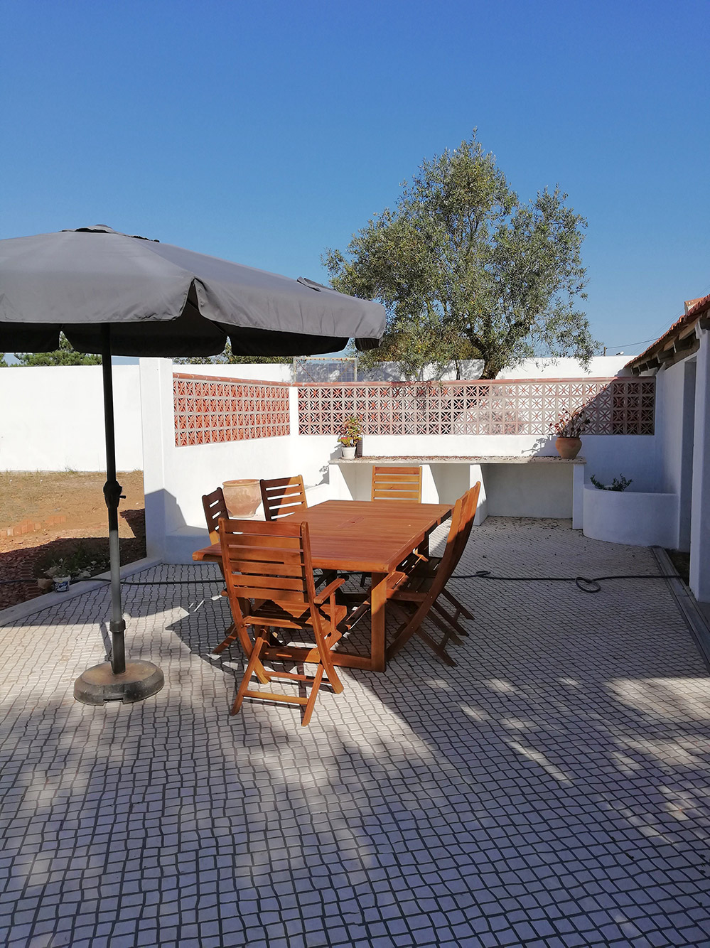 Het terras wordt bewoonbaar! We hebben een mooie tafel gekocht bij de Aki. Van de week in elkaar gezet met Jordyn, onze vrijwilligster. De tafel komt in een groot pakket: een frame, twee steunen, een middenstuk voor de steunen en een inklapbaar gedeelte. Met bijgeleverd inbussleuteltje in elkaar gezet. A la Ikea. En nu staat-ie te pronken in de zon. Met de parasol erbij hebben we nu een lekker plekje om buiten te eten, of om zo maar te zitten. Een aanwinst!
