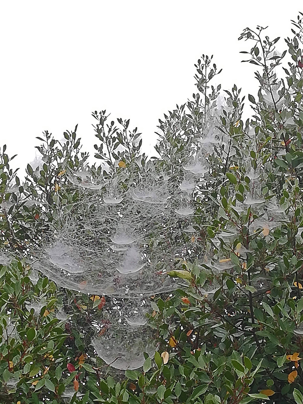 De eerste zonnestralen komen nog niet door. Het is bijna half negen en de wereld is nog in slaap onder de deken van mist. Het geluid wordt heel anders, geluid vanuit de verte hoor je bijna niet meer en het lijkt wel of geluid van dichtbij versterkt wordt. De mist laat druppels achter op bomen en planten. Onder de bomen lijkt het wel of het zachtjes miezert, zoveel lichte druppels komen naar beneden. In de struiken worden de webben zichtbaar van de hangmatspin. De bomen zitten er vol mee. Anders ook wel, maar dan zie je ze niet. Nu komen ze mooi uit met al die kleine druppeltjes eraan. Het is net of iemand de stuiken versierd heeft. De dagelijkse ochtendwandeling krijgt zo een beetje feeërieke sfeer.