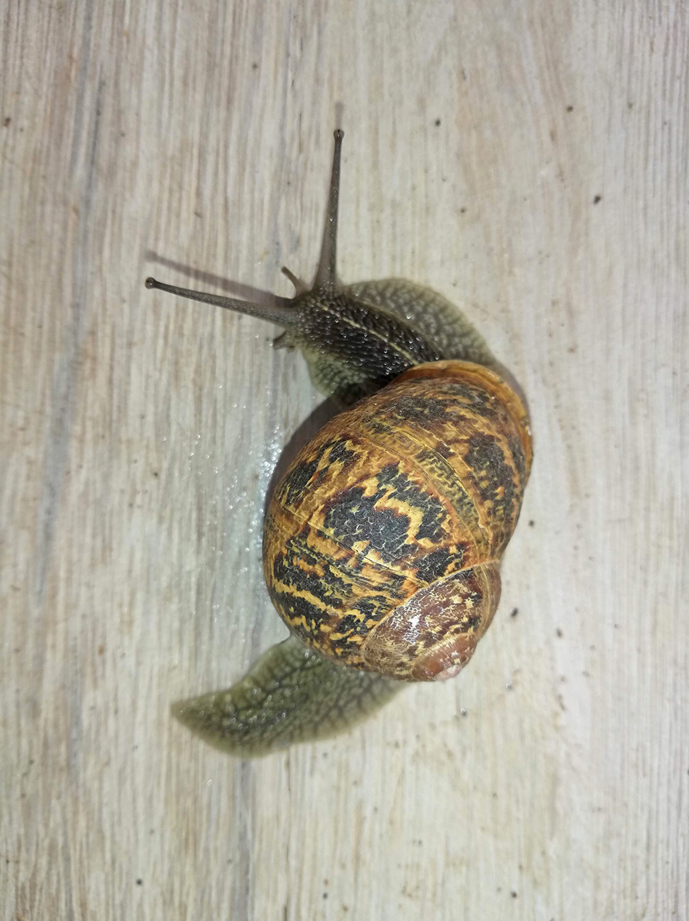 Eindelijk regen. Na een paar weken droogte hadden we vannacht eindelijk weer een regenbui. Het heeft een uurtje of wat aangehouden. Goed genoeg om overal de grond weer nat te krijgen. Bij het opstaan, voordat de honden werden gelopen was het alweer droog. Er hing wel mist in het dal, ’t wordt een vochtige dag. Meteen komen de slakken tevoorschijn. Dee zat op het terras. Het zijn van de grote, die je ook op je bord kunt zien als je escargots eet.