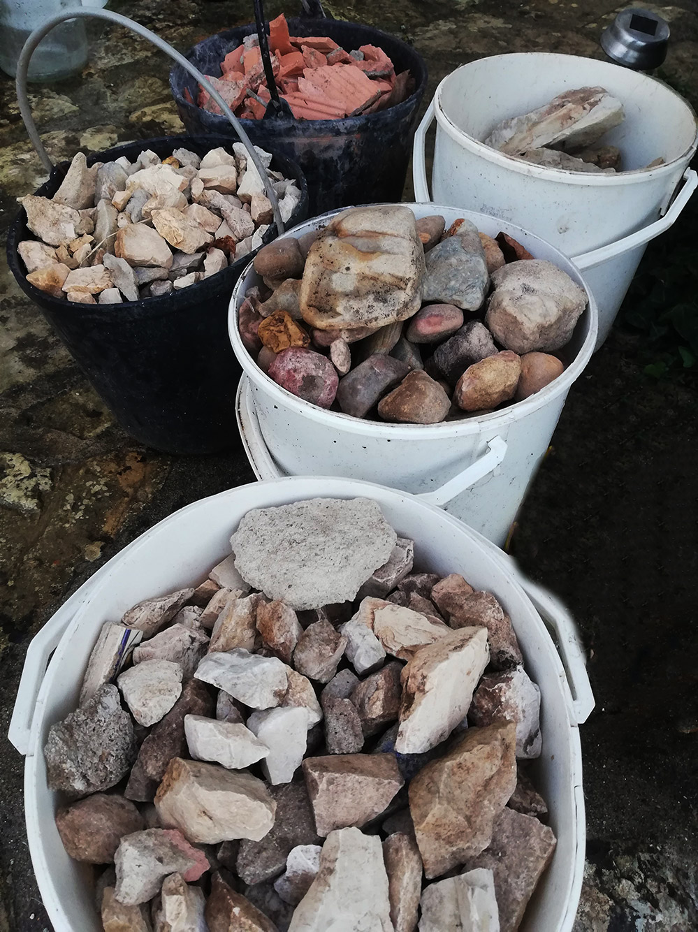 Toen we het huis kochten bleek het hele terrein vergeven van puin. We hebben het pad aangelegd met de terracotta die we her en der vonden. Het laatste gedeelte is het stuk waar de honden lopen, daar liggen heel veel stenen van verschillende grootte. Op de lijst van dingen om te doen voor onze vrijwilligers staat ‘Stenen Rapen’, ook en Caroline en Beverley, onze vrijwilligers hebben besloten elke dag anderhalf uur te besteden aan stenen rapen. Ze zijn vandaag begonnen, nadat ze de mandflessen schoon gemaakt hebben en een groot gedeelte van het pad hebben aangelegd. Het resultaat is een paar emmers stenen, min of meer gesorteerd naar grootte. Ze vinden het vervelend werk, vandaar maximaal anderhalf uur per keer, maar ze doen het gezellig samen, muziekje erbij, zonnetje erbij. Op zo’n manier valt het goed te doen.