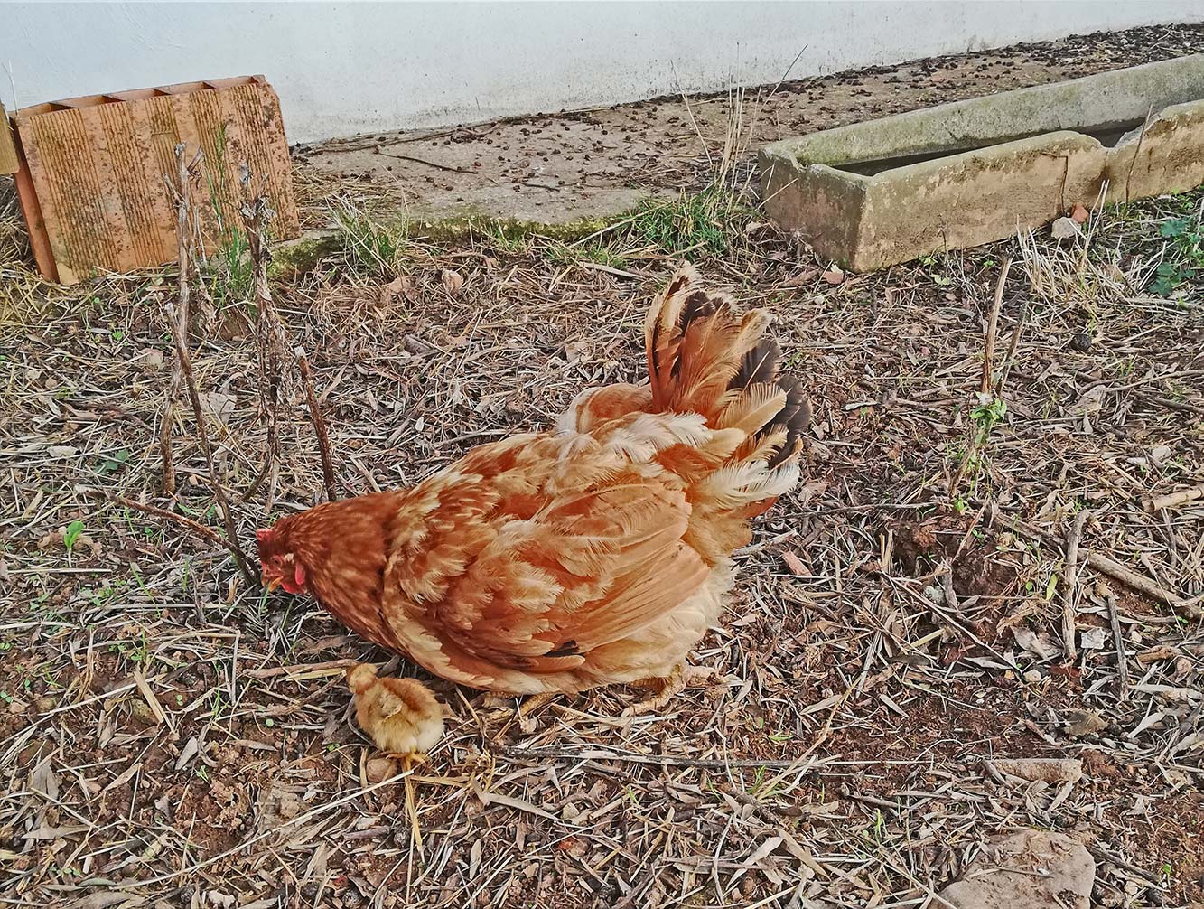 Ze scharrelt al weer vrolijk rond. We hebben haar Próxima genoemd. Het kan ook nog Próximo gaan worden, want we weten nog niet of het een haantje of een hennetje is. Bij het eten geven liep ze al rond met haar moeder Pinóquia in het gedeelte waar de andere kippen overnachten. Pinóquia heeft haar eieren uitgebroed achter de hooiberg, zonder gestoord te worden door Senhor Barcelos, Branca de Neve of Mortícia, maar ze vond het kennelijk tijd zich bij de groep te voegen. Ze zijn wel ruw: Senhor Barcelos stond al eens met zijn poot boven op het kuiken en Mortícia pikt naar het kuiken, kennelijk om alvast de pikorde scherp te krijgen. Pinóquia laat het toe, maar ze maakt zich wel breed door haar vleugels uit te zetten en ze maakt vervaarlijke geluiden. Voor de zekerheid doen we de deur van het gedeelte van het hok waar ze ’s avonds zitten en waar ze nu rondscharrelen diicht. Zo sluiten we de anderen buiten en dan kan in ieder geval Senhor Barcelos er niet bij en de andere twee hennen blijven ook uit de buurt. Nu maar duimen dat het allemaal goed gaat, met de katten en de honden erbij. We houden de honden in ieder geval van ze weg, maar de katten kunnen we niet controleren, of we moeten de kippen opsluiten of de katten niet meer naar buiten laten. Dat gaan we niet doen.