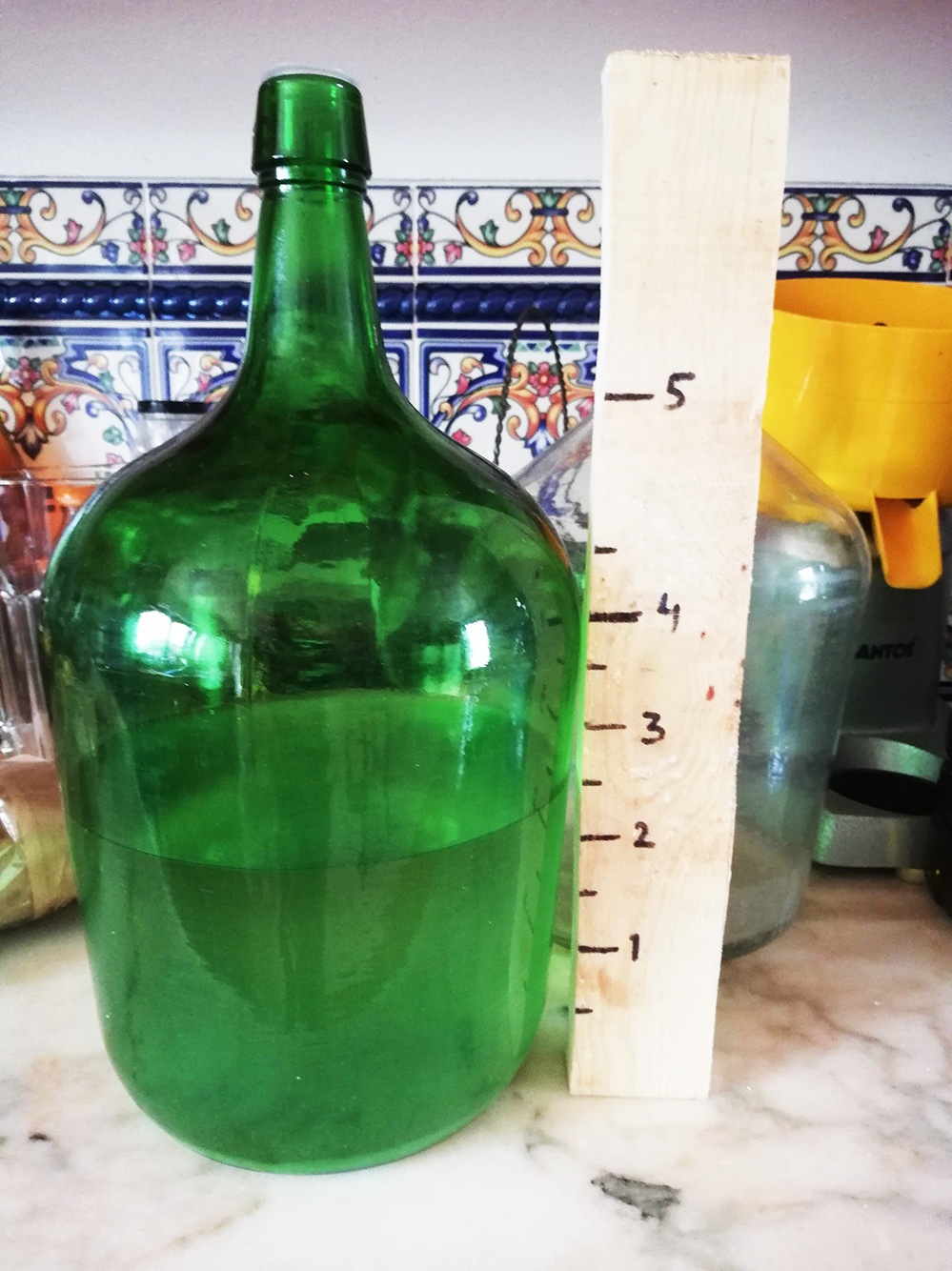 Dat destilleren levert af en toe wat vloeistof op, maar het is moeilijk om precies te weten hoeveel. Natuurlijk kun je het overgieten in maatbekers en dan stukje bij beetje bepalen hoeveel je hebt. Als je een standaardfles vult met steeds een halve liter dan kun je streepjes op de fles zetten en die streepjes overnemen op een maatlat. Dan hoef je die alleen nog maar naast de opvangfles te zetten en je kunt wat preciezer zien hoeveel je gemaakt hebt.