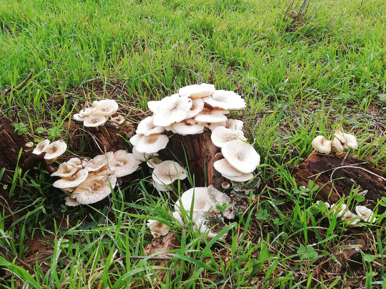Achter op het terrein, waar Lourdes Maria vaak staat te grazen hebben olijfbomen gestaan. Deze zijn al weggehaald ver voordat wij het huis kochten, maar de restanten staan er nog. De plek waar de boom gestaan heeft kun je terugvinden doordat er een ring van vermolmd hout in de grond zit. De ring is de stam van de boom geweest. Het binnenste is door moeder Natuur al opgeruimd, maar de rand, de bast van de boom is wat lastiger. Deze rand is nu een voedingsbodem voor prachtige paddenstoelen. Er staat een mooi groepje op de rand en daardoor in een soort halve cirkel. En op een stuk hout dat eraf gevallen is, of op andere manier daar terechtgekomen groeit ook een klein groepje.
