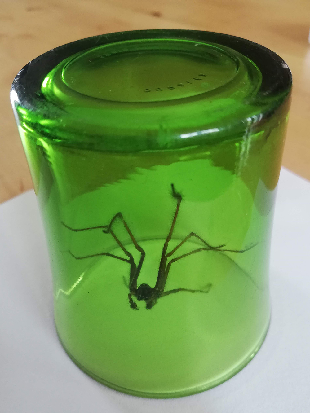 Zit je rustig op een stoel een beetje voor je uit te telefoneren, loopt er een huisgenoot over de vloer. ’n Beetje onduidelijk waar-die vandaan komt. Of van buiten, want de deur staat eigenlijk de hele dag open, of van onder de grond. Onder de vloer is waarschijnlijk een kruipruimte met zand, dus dat zou een goede verblijfplaats zijn. Het is ieder geval een fijn grote jongen. Met poten erbij al gauw zo’n acht centimeter. We hebben hem gevangen met behulp van een glas en hem naar buiten gebonjourd. Een flink eind van het huis vandaan, anders istie zo weer binnen. Valse hoop natuurlijk dat we daarmee van de spinnen af zijn, er zullen er ongetwijfeld nog meer volgen, maar deze is in ieder geval voorlopig weg.
