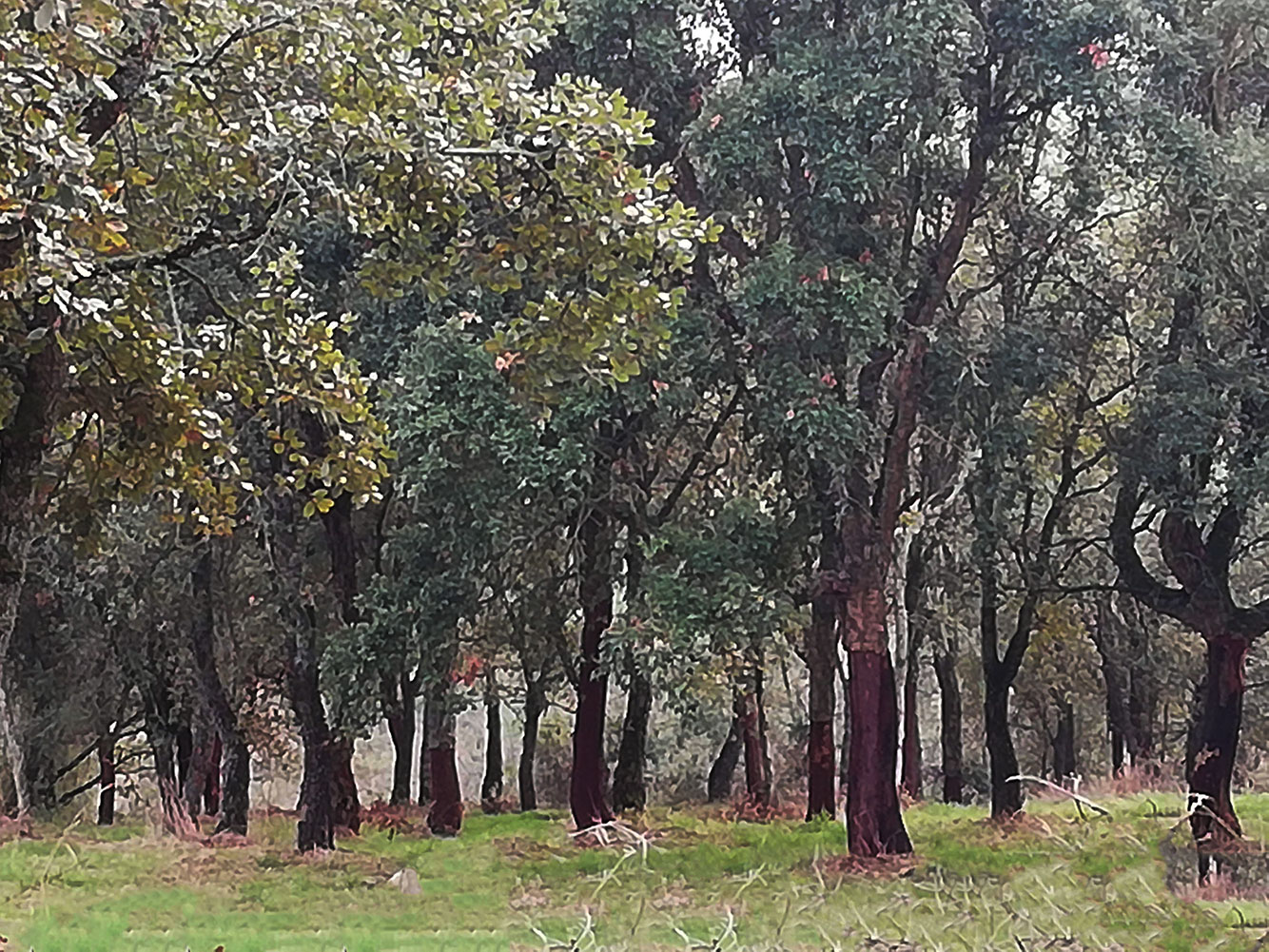 ’s Ochtends en ’s avonds als we het vast rondje lopen met de honden komen we langs een kurkeikenbos. Het staat iets van de weg af en het terrein loopt naar beneden naar het dal met aan de overkant Casal da Marinha. Als de zon zo’n beetje aan het opkomen is en er hangt nog een beetje mist in het dal, krijg je wat feeërieke plaatjes. Doordat de kurkeiken net ontdaan zijn van hun bast en het tegelijkertijd erg vochtig weer is, krijgen de stammen een diep donkerrode kleur, bijna zwart.