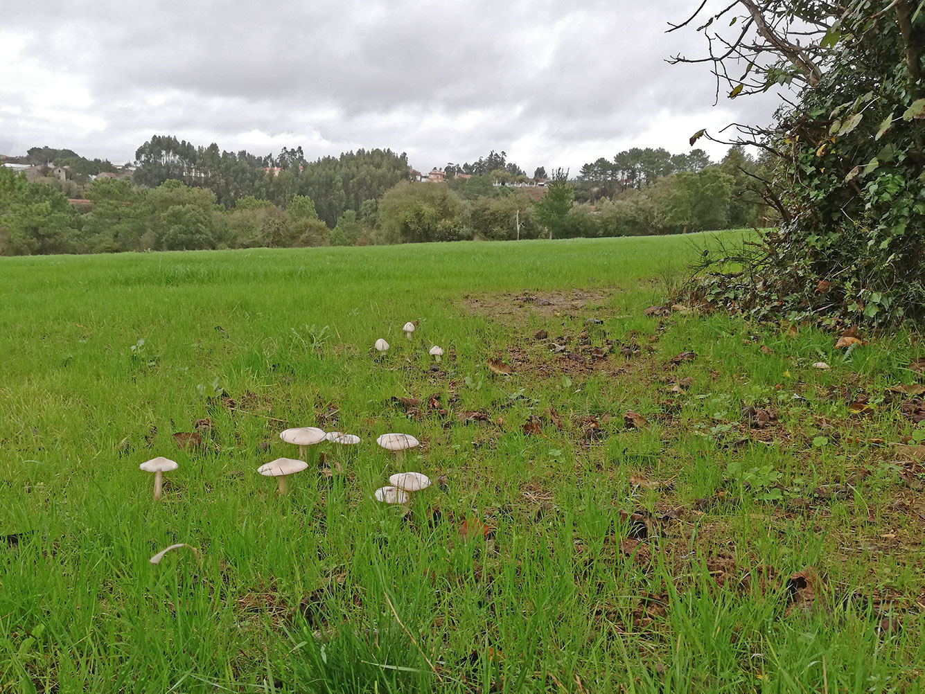 In het weiland aan de overkant begint het gras alweer goed te groeien. Tussen het gras zitten de paddenstoelen. Ze beginnen als een klein pilaartje met een dikke kop en een paar dagen later ontvouwen de hoedjes zich als een paraplu en krijg je zo’n karakteristiek paddenstoelfiguur. De meeste worden stukgelopen door honden of ander spul dat over de weilanden loopt. Deze blijven goed intact doordat ze in de beschutting van een paar bomen staan.