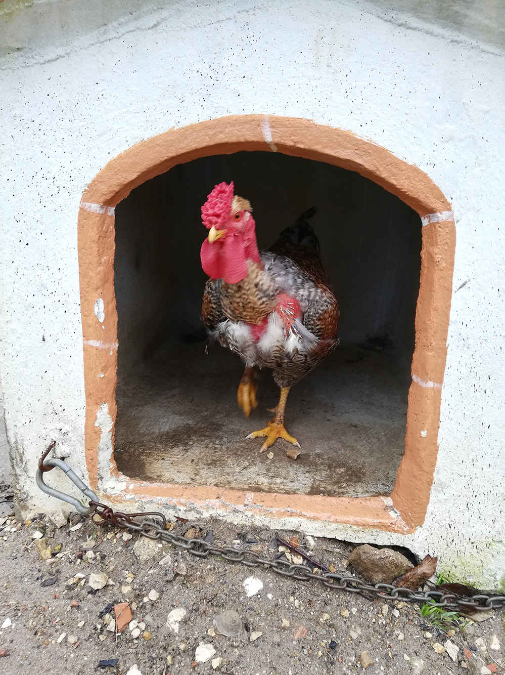 Overdag lopen de kippen over het terrein, en als er dan een plotselinge regenbui is, die als een moesson enkele minuten lang staat te stortregenen dan zoeken ze de dichtstbijzijnde schuilplek en dat is vaak Karma’s hok of Max’ hok. Het hondenhok verandert dan ineens in een kippenhok. Geen voorkeur voor dat van Karma of dat van Max. Het meest dichtstbijzijnd is het beste.