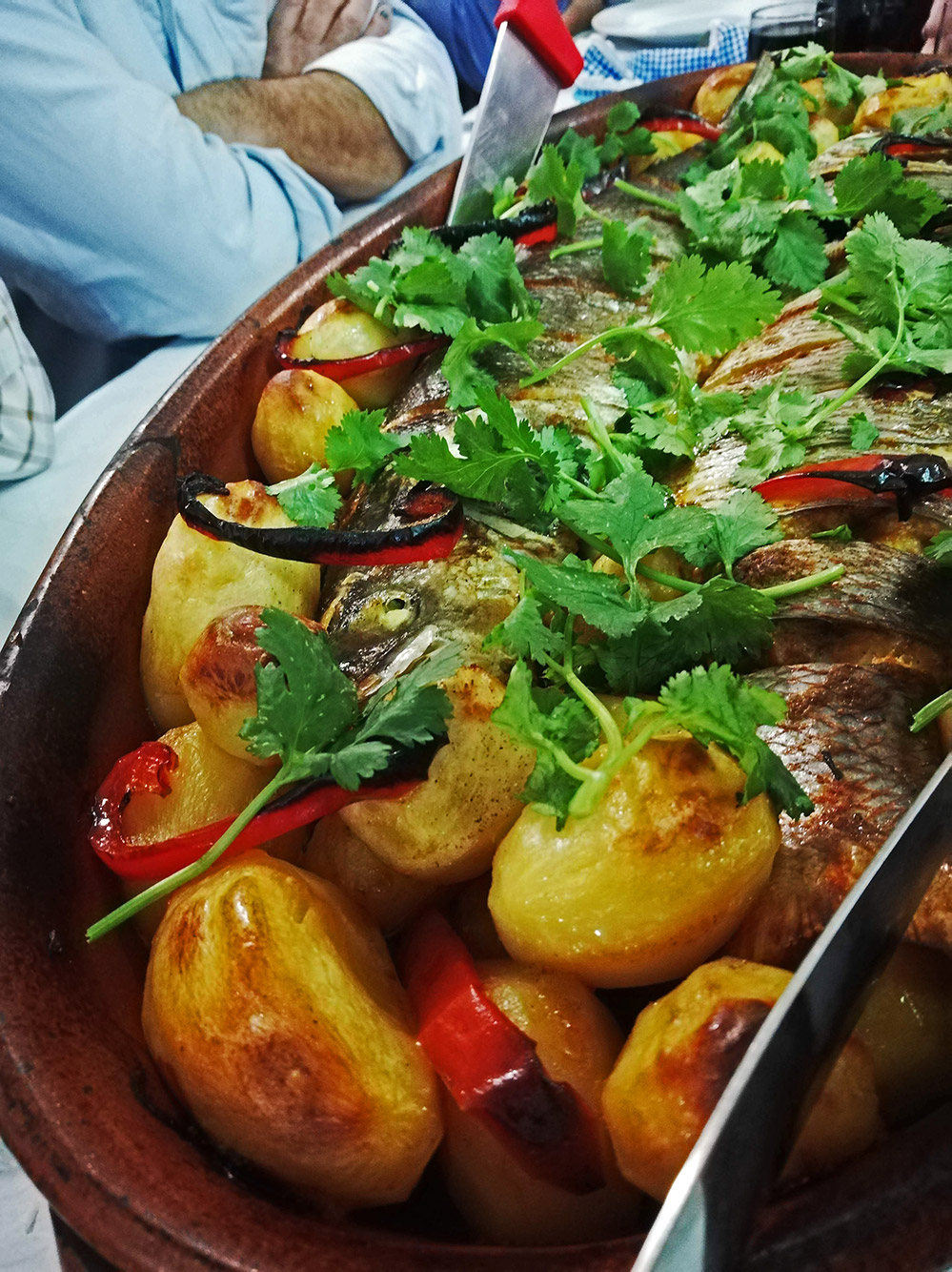 Christiano, dat is de man van het restaurant vist ook, en als hij mooie vis gevangen heeft belt hij David. Zo zaten we ineens te eten van rode snapper. Twee grote vissen in een grote schaal. In zijn geheel in de oven, dus dat moet wel een flinke oven zijn. De vis is fantastisch lekker. Hij gaat de oven in met aardappelen, uien, peterselie en waarschijnlijk nog wel meer. Twee vissen zijn samen genoeg voor zeven man. Dus er was ook nog een bijschotel van bacalhau.