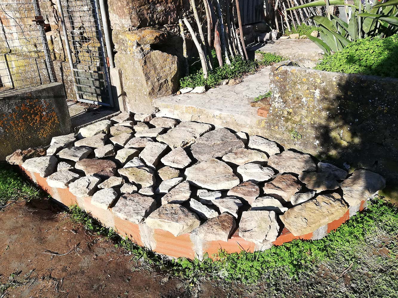 Deze dag stond in het teken van stenen zoeken op het terrein en in een patroon leggen. Het is even zoeken, want het moet wel allemaal in elkaar passen zonder al t grote voegen. Sommige stenen zijn wat dunner dus die hebben een steuntje van cement nodig en andere liggen vervaarlijk te wiebelen, dus die moeten gestabiliseerd worden maar na het nodige puzzelwerk ligt er een mooi vloertje. Er moet nog cement tussen om het goed stevig en stabiel te maken, maar het ziet er al aardig uit. Misschien doen we dat morgen, als het weer het toelaat.