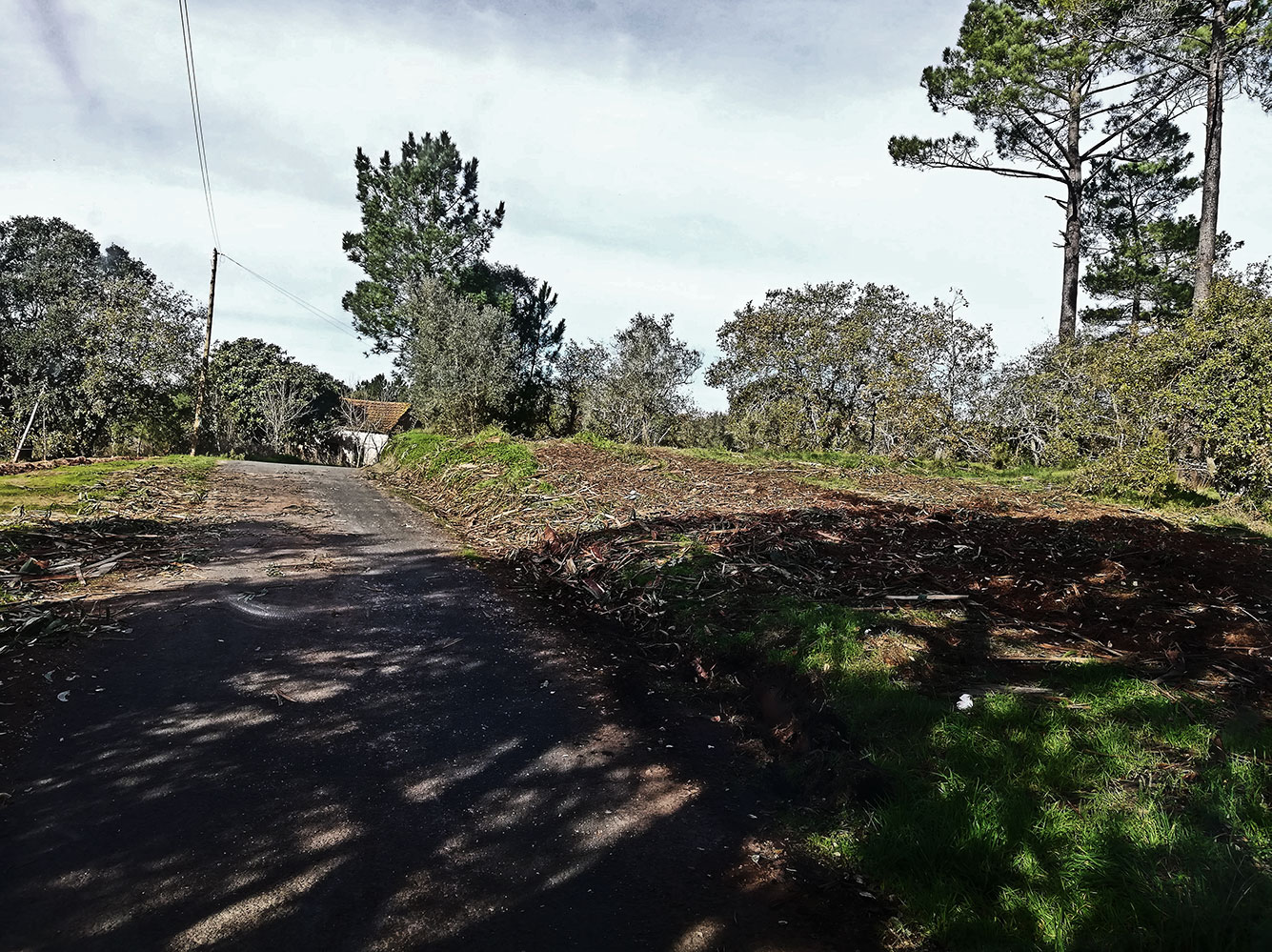 Aan het begin van het weggetje bij de Y-splitsing tussen Estrada do Lumião (links) en Rua do Lumião (rechts) is een driehoekig stukje land dat de laatste dagen wordt gebruikt als opslagplaats en overslagplaats van eucalyptushout. Er staan regelmatig grote vrachtwagens de weg te versperren, op het driehoekje staan af en toe grote stapels stammen. En err rijdt een groot landbouwvoertuig rond. Heel grote wielen, een grijper en een aanhangwagen. De wielen laten grote sporen achter in het land, de grond is nog zacht van de regen van de afgelopen dagen. Het landbouwvoertuig zakt er een stukje in weg, wat de sporen nog dieper maakt. Het ding moet ook manoeuvreren, en bij het draaien aan het stuur gaat de grond helemaal aan gort. Daarnaast heeft een eucalyptus de neiging om de bast los te laten, dus de schillen liggen overal. Kortom, het ziet er uit als een ravage. Het gaat zich wel weer herstellen, de omgewoelde grond is zo weer bedekt met groen, en de eucalyptusbast zal ook wel uit zichzelf verdwijnen. En ondertussen geurt het heerlijk.