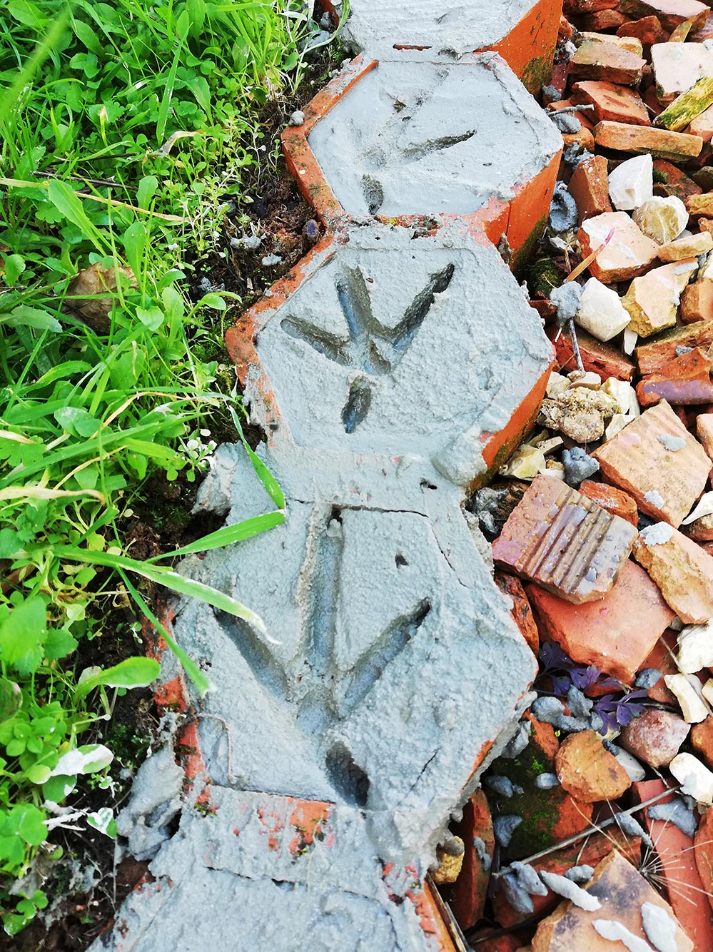 Het pad dat naast het oude huis naar achteren loopt hebben we gemaakt van scherven dakpannen. Aan de zijkant hebben we terracotta zeshoekig aardewerk in de grond gedaan om het pad op te sluiten, zodat de dakpanscherven niet weglopen. Dat zeshoekig aardewerk is waarschijnlijk bedoeld om een wijnrek van te kunnen bouwen. We hebben nog heel wat van die dingen staan, en het ziet er ook echt uit als wijnrek. De vorige bewoners waren waarschijnlijk van plan erg veel wijn in te slaan of erg veel wijn te maken want tegen het oude huis stond een dubbele rij. We hebben al heel wat verwerkt in het pad, en we hebben nog een stuk te gaan. Het gedeelte wat klaar is storten we vol met cement. We zijn begonnen met elke keer een restje dat we over hadden, van een ander klusje in de gaten te doen, maar nu hebben we speciaal daartoe cement aangemaakt zodat we een heel stuk ineens konden doen. Als je je omdraait en even wat anders gaat doen, bijvoorbeeld het gereedschap schoonmaken, staan er direct grote hanenpoten in het verse cement, alsof ze erop staan te wachten. Ook de katten staan er voortdurend met hun neus bovenop en hebben er een handje van over het verse cement te lopen. De hanenpoten zijn wel spectaculairder.