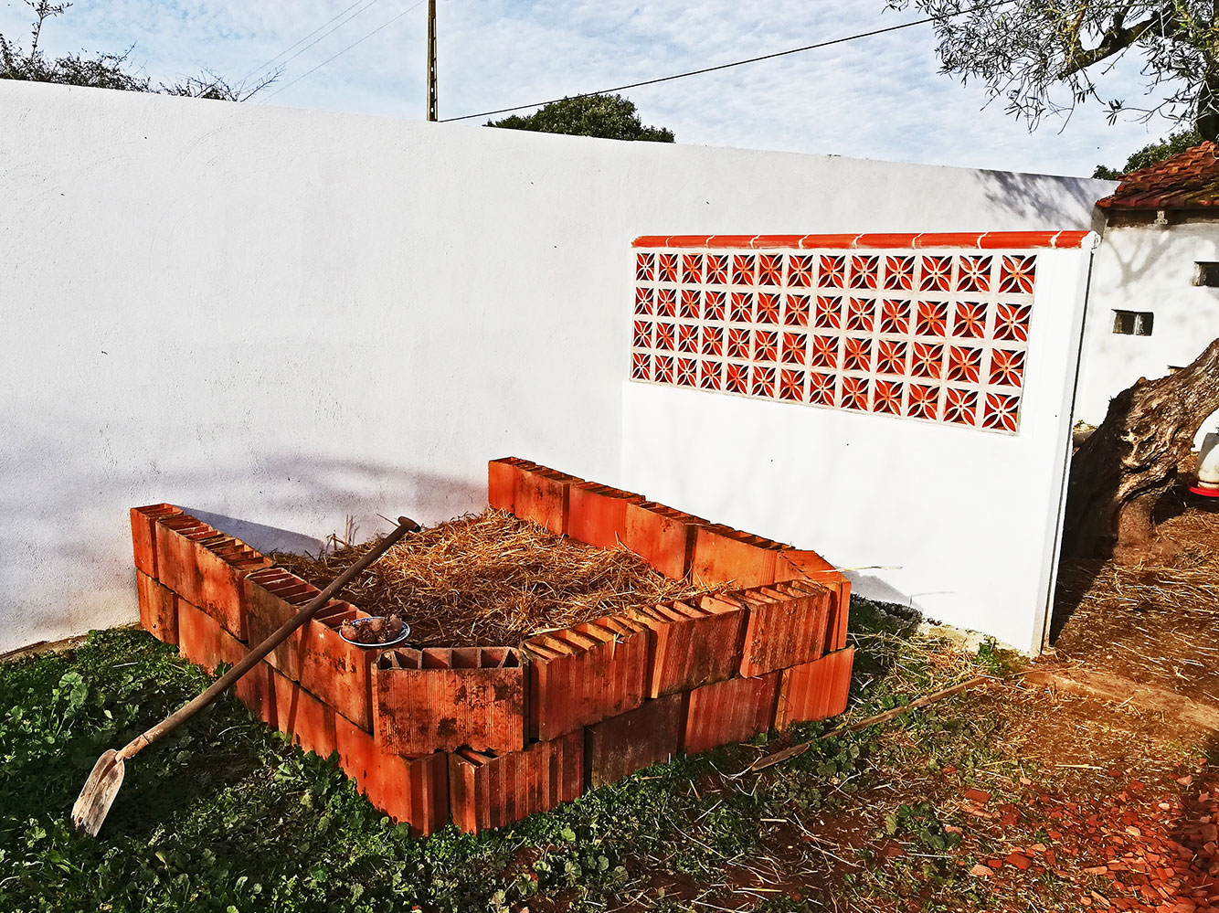 De vorige bewoners hebben van alles laten liggen. Onder meer hele stapels plafondtegels. Dat zijn tegels, of eigenlijk terracotta stenen, die op balken in het plafond worden gelegd en dan afgestuct. Het is volkomen onduidelijk wat ze ermee wilden doen. Misschien wilden ze wel een vliering of iets dergelijks maken in het oude huis. Hoe dan ook, wij hadden ze verzameld en opgestapeld (met hulp van Arthur!), ze hebben al eens gefunctioneerd als muur voor een moestuin. Die moestuin moest wijken voor wat nu het terras is, dus die tegels stonden alweer een tijdje gestapeld achter op het terrein. Nu hebben we bedacht dat we er kweekbakken voor aardappelen van gaan maken. Het muurtje wordt gestapeld, in verband natuurlijk voor de sterkte. Op de bodem komt karton als een soort worteldoek om het onkruid van onder tegen te gaan. Dan rottend hout wat we her en der nog vinden op het terrein en dan een dikke laag stro die we overhouden als we de stal van Lourdes Maria en de kippen uitmesten. De mest zit er vanzelf al bij. En de aardappelen komen uit de supermarkt, maar ze hebben te lang gelegen en zijn gaan uitlopen. Hergebruik dus!