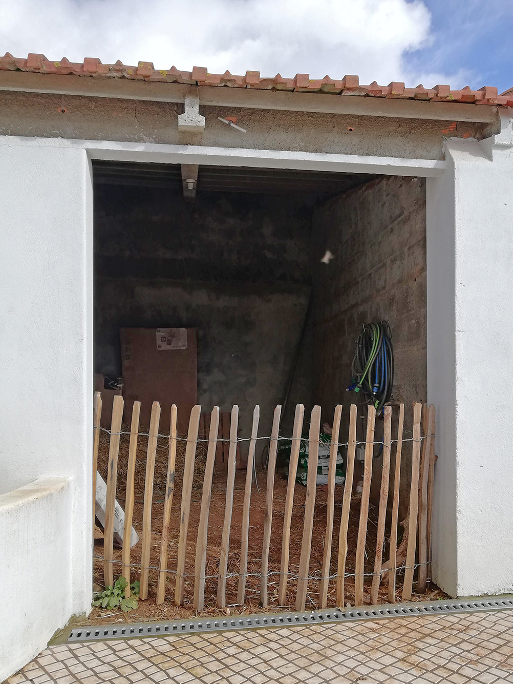 De hennen gebruiken de ruimte achter de strobaal als legplek en als broedplaats. Op zich niet zo erg, maar ze maken er een gewoonte van het stro te verspreiden zo ver als ze maar kunnen. Van het hok waar het stro ligt maken ze een eigen stal, het stro ligt over de hele vloer verspreid. Dat moest maar eens afgelopen zijn, tenslotte hebben we de stal zo ingericht dat het een perfecte legplaats is. We hebben de ingang afgesloten met een hekje. Het is een stuk schapenhek dat rechtop gehouden wordt door aan de ene kant een pak tegels en aan de andere kant een dikke tak. Het staat lekker gammel. De kippen houden niet van gammele hekjes, ze willen altijd op een hekje springen/fladderen en er aan de andere kant weer af, en bij dit hekje lukt dat niet. Er in één keer overheen vliegen doen ze niet, gelukkig.