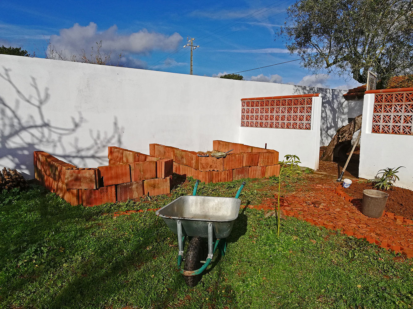 De bakken staan steviger dan we dachten toen we ze gingen bouwen, we hebben niet veel meer gedaan dan de ondergrond wat egaliseren en de aarde onder de stenen aangestampt. De stenen staan wel in verband, dat helpt natuurlijk en ze hebben een rand waarop ze normaal gesproken hangen, en door de stenen om en om te zetten grijpt die rand in elkaar en dat maakt het ook wat stabieler. Je moet er niet op gaan lopen, dat zou onverstandig zijn. Hilarisch misschien, maar waarschijnlijk ook pijnlijk.