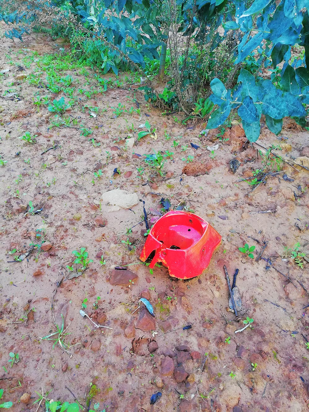 Op de wandeling van woensdag zagen we in de verte tussen de eucalyptusbomen een grote rode paddenstoel. Het was al tegen donker en we hadden geen telefoons of fototoestel bij ons, dus we besloten een andere keer terug te gaan. Die andere keer was vanochtend. We gingen weer voor een lange wandeling met de honden en we gingen ongeveer hetzelfde rondje lopen én we hadden de telefoon mee. Dus op zoek naar de paddenstoel. Tussen de eucalyptusbomen vonden we hem snel terug. ’t Was alleen geen paddenstoel, maar een soort van felrood plastic hondenvoerbak dat ondersteboven een vliegenzwam probeerde te imiteren. Wij waren er in ieder geval ingetuind. De teleurstelling duurde niet te lang, hoor. We hebben lekker gewandeld, nieuwe weggetjes ontdekt. Allemaal goed.