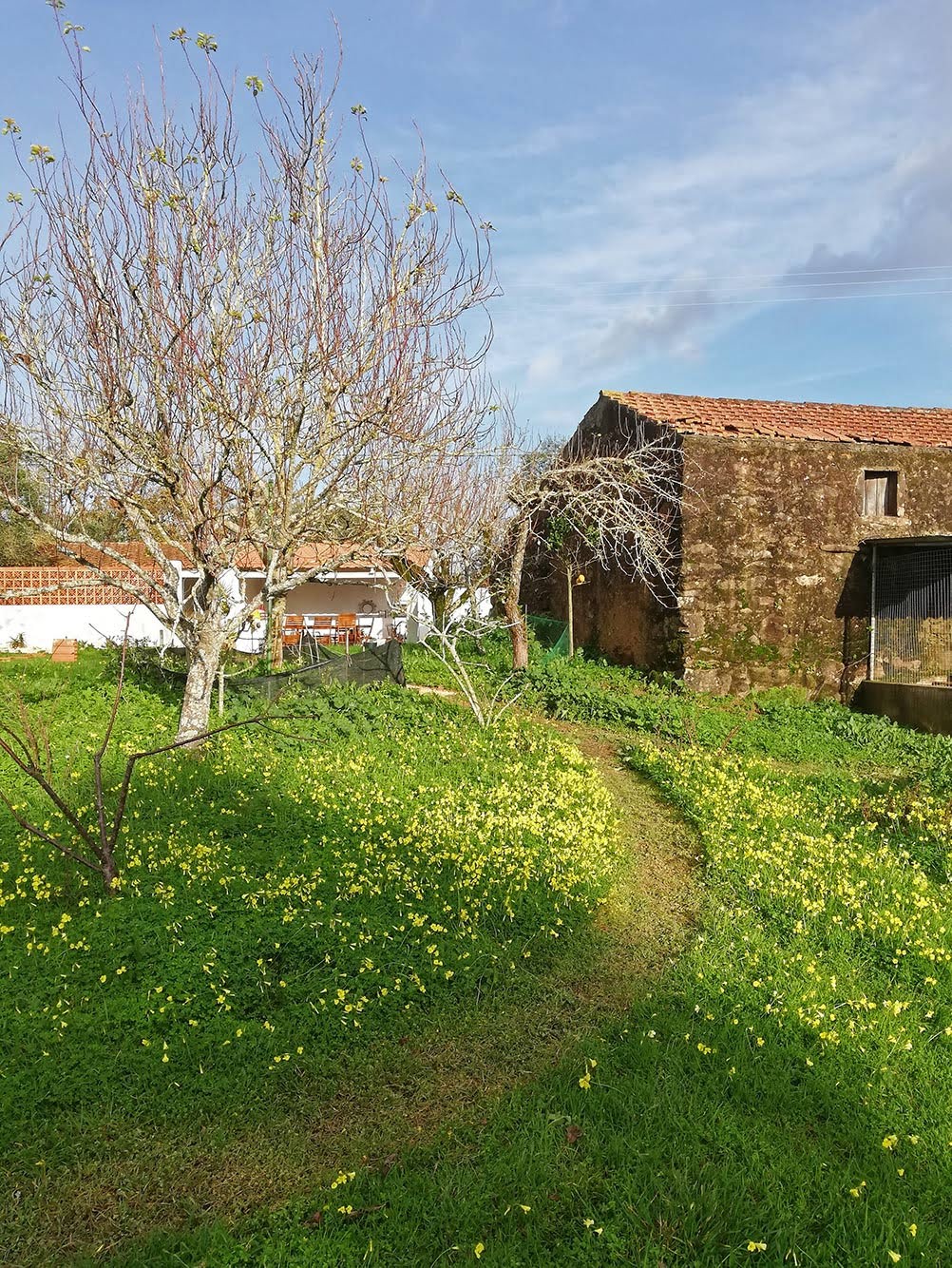 De regen is gestopt! We hebben de hele dag géén regen gehad. Het heeft de afgelopen tien dagen bijna continu geregend met af en toe een uurtje zon, maar vandaag hebben we een stralende dag. Het is mooi om te zien, de klaver begint meteen volop te bloeien en dat maakt het terrein helemaal geel. De bijen zijn ook meteen wakker, als je door het veld loopt zoemt het aan alle kanten, het lijkt meteen een zomerse dag. We hebben een paar paadjes gemaaid, zodat we elke keer op dezelfde plek lopen, anders trappen we misschien het hele terrein plat, en dat vindt Isabela niet leuk. Die houdt niet van platgetrapte grassprieten.