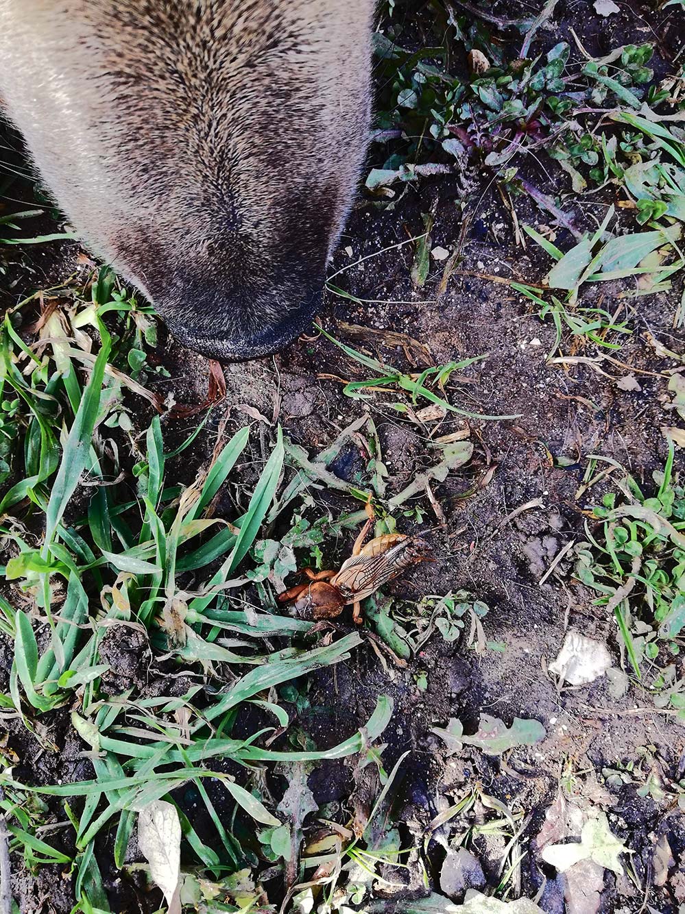 Een veenmol is een insect dat op een krekel lijkt, maar geen krekel is. Het is een groot insect, ik geloof dat ze wel 5 cm groot kunnen worden. Ze leven in zachte grond, dus ons terrein is prima voor ze. Ze hebben de pech dat ze een beetje tjirpen, en dat triggert Karma. Die gaat lekker zitten graven tot het diertje boven de grond is. Het arme dier probeert snel weer onder de grond te verdwijnen, maar dat vindt Karma niet zo’n leuk spel, en die houdt dat steeds tegen. Uiteindelijk eet de Karma het diertje op.