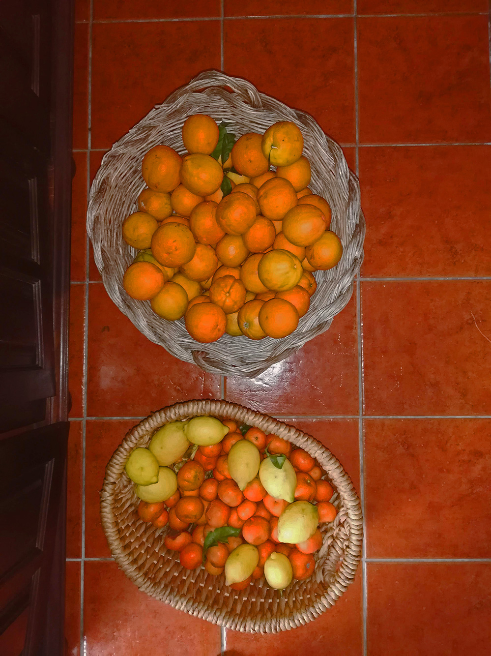 Leonel en Marijke zijn een stel dat hier vlakbij woont, net op de grens van Casal da Marinha, het stukje bij hun heet Casal da Azenha. We hebben het opgezocht, Azenha betekent watermolen, maar in geen velden of wegen is hier zo’n ding te zien. Marinha betekent trouwens zeetje, dat is hier ook nergens te bekennen. Leonel en Marijke zijn Portugees en Nederlands. Zoals veel Portugezen heeft Leonel op een booreiland gewerkt en heeft veel in Nederland vertoefd. Als we met hem spreken gaat dat in een mengelmoes van Engels, Portugees en Nederlands. Maar we komen er prima uit. Ze hebben achter hun huis een boomgaard met veel sinaasappels en citroenen. Ook veel andere bomen, maar deze staan er wel het meest. Er zijn kennelijk verschillende rassen sinaasappels, die van ons hangt vol met vruchten, maar die zijn net nog niet rijp voor de pluk. Die van Leonel zitten bomvol, zoveel dat ze er zelf geen weg mee weten, en dan is een goede buur altijd prettig. Afgelopen weekend kwamen ze twee manden brengen, net van het land en supervers! We zijn begonnen met de citroenen in te maken en voor de sinaasappels vinden we ook wel een bestemming. Marmelade?