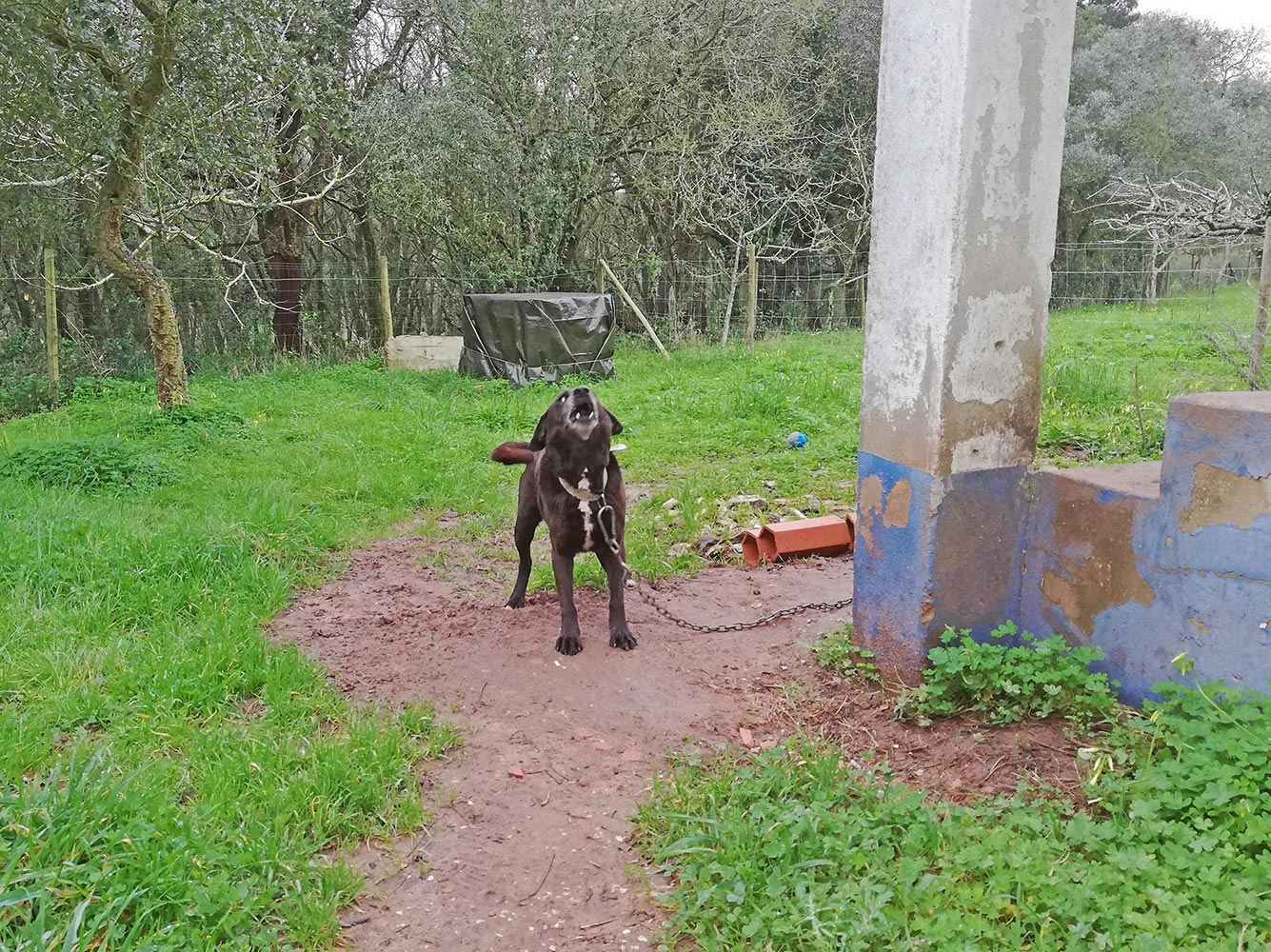 Het is alsof hij kan klokkijken. Elke dag om acht uur begint Xarique te blaffen. Niet in paniek, en geen gehuil, maar als een variant van de Damiaatjes. Wáf wáf, waf waf grrr. En dat herhaalt zich een half uur lang. Niet dat hij uit zichzelf stopt, het is meer dat wij een half uur nodig hebben om ons aan te kleden, de kippen eten te geven, de geit in de wei te zetten en de riemen van de honden tevoorschijn halen. Max aan de lijn, Karma aan de lijn en dan naar Xarique. Die stopt dan acuut met blaffen en gaat als een gek een paar keer het terrein in de rondte rennen, dan gaat hij gewillig aan de lijn en rent de weg op. Snuffend en snuivend met zijn neus aan de grond.
