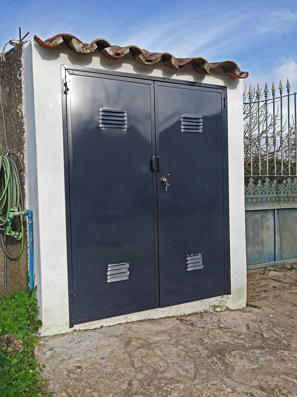 In de eerste plaats een welgemeend excuus, en schaamrood op de kaken. Vitor, de schilder,  hadden we beschuldigd van het verkeerde stuk van het frame van de deuren van het gashuis te hebben gezaagd. Dat was niet zo, dat stuk had er nooit opgezeten. We hadden Fernando gevraagd, die heeft de deuren gemaakt, hoe het precies zat met dat frame, en hij zei dat de onderste balk er nooit op gezeten heeft en dat hij dat met opzet heeft gedaan, omdat anders de gasflessen erachter zouden blijven hangen. Foutje van ons dus. Weer terug naar Vitor dan, om het ding weer op te halen. En vandaag, eindelijk, hebben we de deuren op kunnen hangen. Het is het einde van een verhaal dat is begonnen in november 2018, het is een lang verhaal geweest en dat is vandaag tot een einde gekomen. En wat staat het mooi!
