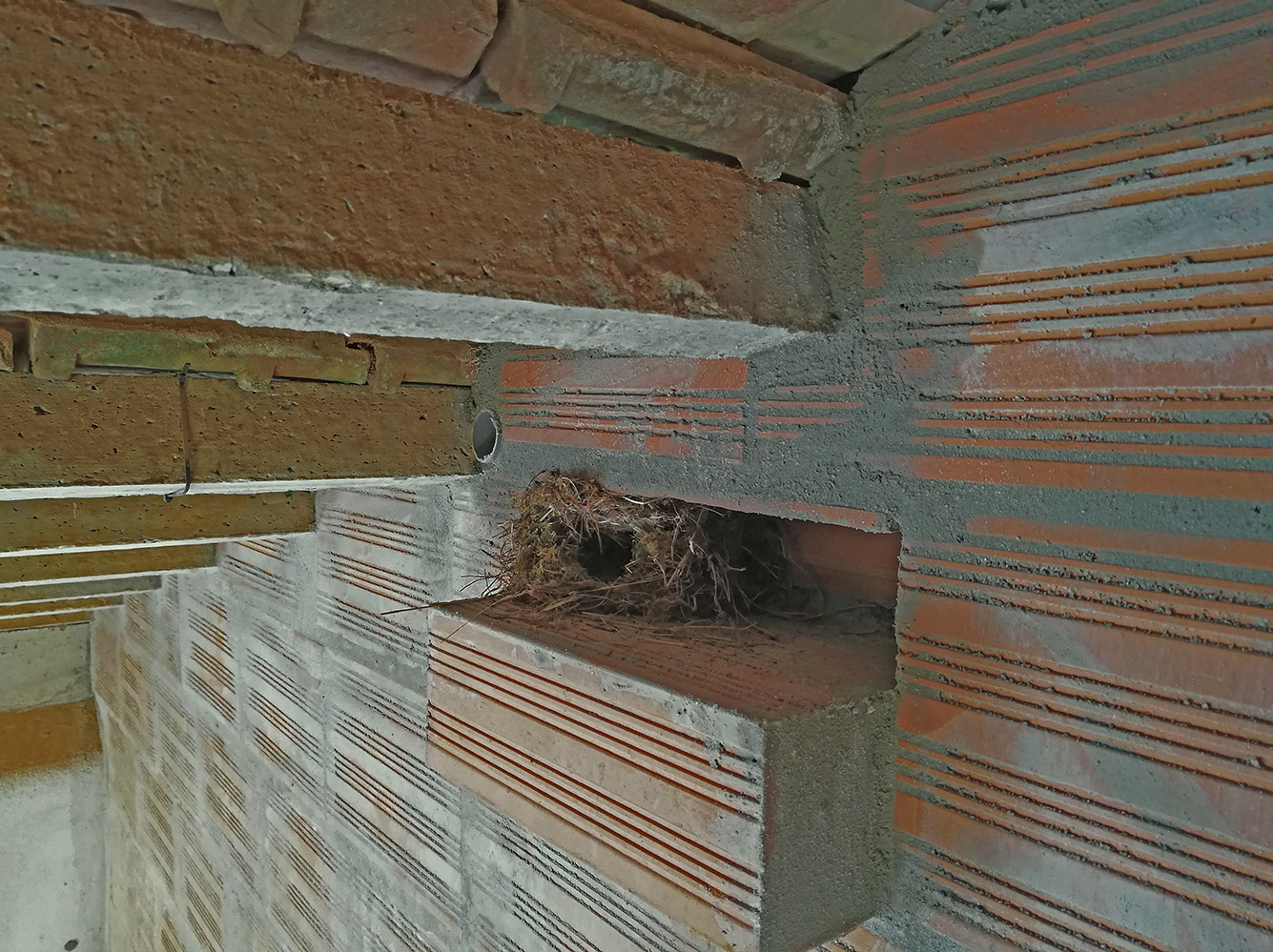 Het muurtje is zo goed als klaar. De laatste laag is erop gelegd. De stenen zitten tussen de dakbalken en voor de laatste laag moesten ze alle op maat gemaakt worden. Dat ging dus niet zo snel. Maar één kant is nu helemaal klaar wat metselen betreft. Er moet nog een stuclaag overheen, maar dat kan nog wel even duren voordat we iemand gevonden heeft die dat goed kan. De andere kant moet nog gevuld worden. De voegen van de bovenste laag zijn nog niet dicht gemaakt. Daarvoor hebben we het steigertje nodig en daarvoor moest eerst deze kant af. Omdat we er niet meer bij kunnen hebben we het vogelnestje ook meteen maar teruggezet. Het vogelnestje zat helemaal bovenin, tegen het dak. Vorig jaar broedde er een zwart-roodstaartjestel. De jongen hebben het toen niet gehaald. We weten niet waarom, maar nu denken we dat het nest te dicht onder het dak zat en het daarom te warm werd in de zon, want het nest zat zo’n beetje tegen de dakpannen aan. We hebben nu een uitsparing gemaakt in het muurtje en er een soort van balkonnetje voor geconstrueerd, opdat het stel makkelijk in en uit kan vliegen. Het oude nestje hebben we bewaard en teruggezet, in de hoop dat dat ze helpt. Geen idee of zwarte roodstaartjes naar hun oude nest terugvliegen, maar alle beetjes helpen en als ze het oude nestje niet willen, dan kunnen ze toch een nieuwe maken?
