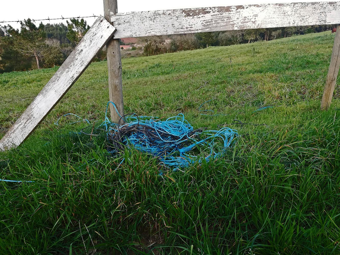 Een paar dagen terug zijn de paarden teruggekomen op het weiland aan de overkant. Het hek waar de paarden doorheen gaan als ze aankomen is een beetje provisorisch hek. Het is eigenlijk een groot stuk gaas, dat met touw aan het vaste hek wordt vastgemaakt. Het touw is van nylon en fel blauw gekleurd. De mensen van Fonseca, dat is de eigenaar van de paarden, gebruiken een stukje touw en laten de rest gewoon liggen. Tenminste daar lijkt het op. We lopen er elke dag langs als we de honden lopen en we kijken het wel even aan. Als het er over een week nog ligt dan zullen we het opruimen. Dat doen we sowieso meestal: tijdens het rondje met de honden de rotzooi opruimen die we tegen komen. Er ligt altijd wel ergens plastic of andere rommel, dat nemen we dan gemakshalve even mee en gooien dat in de vuilcontainer waar we toch langs lopen.