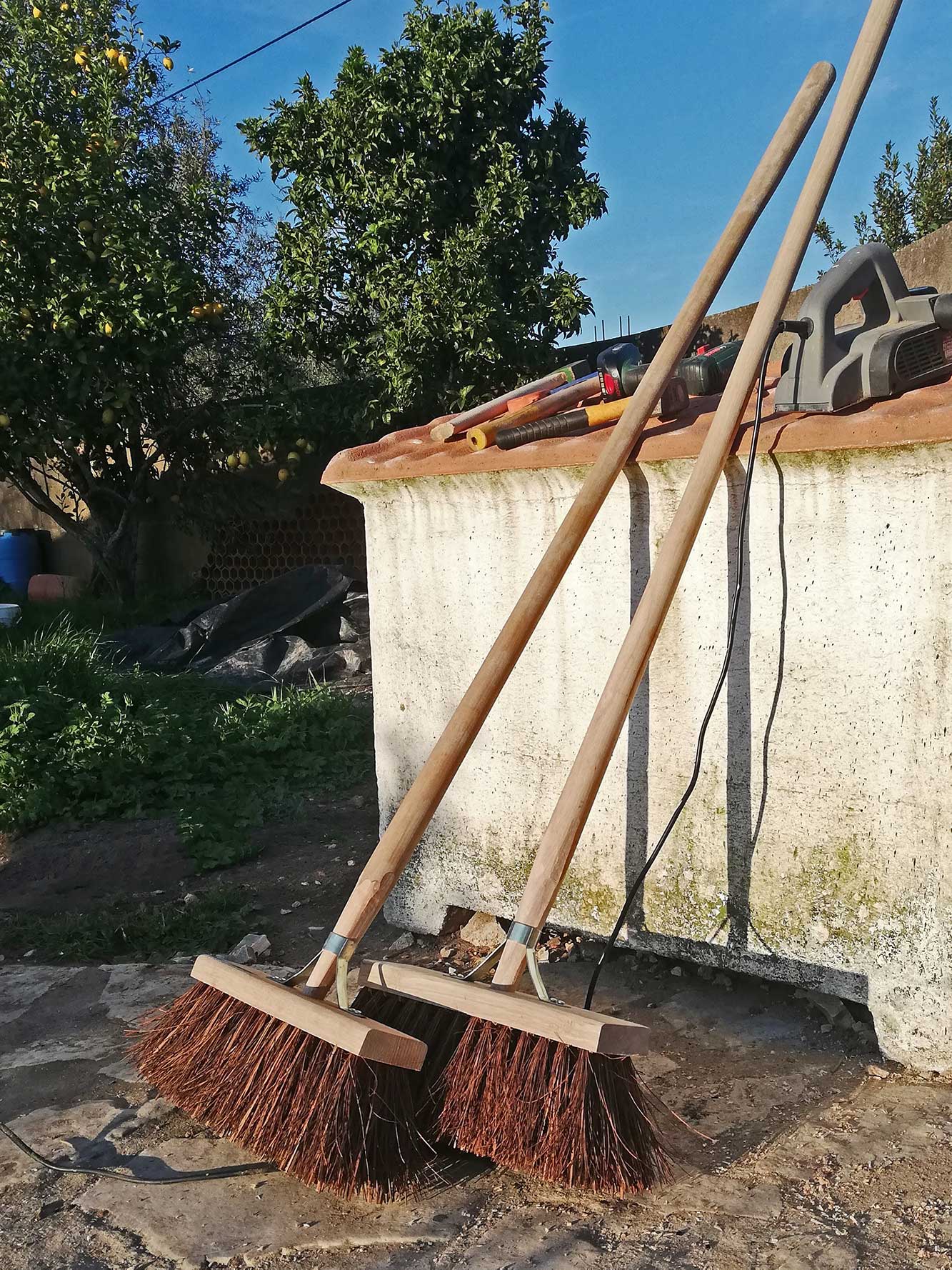 Nederlandse bezems met Portugese stelen. Het kan zo maar internationaal zijn! In Portugal kennen ze niet de grote stevige bezems die we in Nederland hebben. Wel veel met plastic haren, maar dat is toch eigenlijk niks. Wat je ook wel ziet zijn bezems van riet, met een korte steel, meer een soort stoffers. Ook erg handig maar niet als je een stuk terrein moet aanvegen. We hebben daarom drie van die grote bezems meegenomen uit Nederland en hier hebben we stelen gekocht op de markt. Helaas past dat niet meteen want de bezem heeft een smal gat en een wat wijdere opening in het metalen gedeelte waarmee de steel stevig vast gezet wordt. Er moest dus wat geschaafd en gesneden worden, maar het resultaat is mooi en stevig! We hebben nu drie mooie grote stevige bezems. Wat kan een mens daar gelukkig mee zijn!