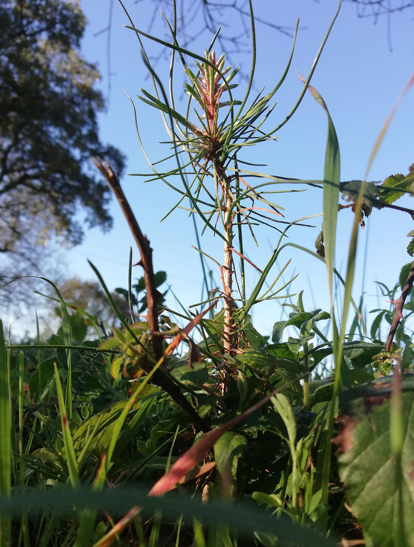 Op ons terrein staan een stuk of vijf pijnbomen. Het zijn grote bomen waarin heel wat dennenappels komen. Die worden merendeels opgegeten door de eekhoorns. Niet dat we die zien op ons terrein, want daarvoor zijn ze te schuw. We hebben ze wel eens in het bos langs het weggetje gezien. Ze hippen over de weg en schieten gauw een boom in, waar je ze niet meer kan zien, want ze gaan altijd aan de andere kant van de stam zitten. Je kunt wel zien dat ze op ons terrein komen, want we vinden regelmatig afgekloven dennenappels op de grond. Heel af en toe valt een dennenappel gunstig en kan de pijnboompit ontkiemen en ontstaat er zomaar een nieuw boompje. Het exemplaar op de foto is iets meer dan tien centimeter groot, dus die heeft het gehaald en is ontsnapt aan de eekhoorns. Het plantje staat op een gunstige plaats, er loopt nooit iemand, het staat aan de rand van het terrein, langs de weg, maar dan hoog. Het weggetje ligt een stuk lager dan de berm, er kan dus ook geen uitwijkende auto overheen rijden. De eigenaar van het terrein woont in Canada, en het wordt dus ook niet elke dag gemaaid. Een goede toekomst voor het boompje!