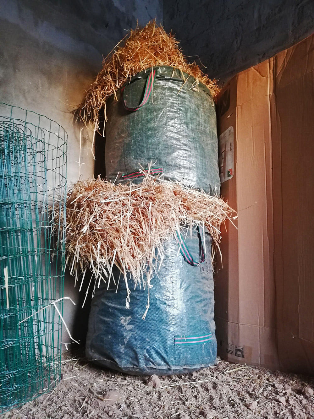 Een historisch ogenblik! Ruim een jaar geleden hebben we een baal stro aangeschaft. Het ding was zo groot dat het maar net in het busje paste. (Kijk hier!) We zijn toen een middag bezig geweest om het op zijn plaats te krijgen. Het hele jaar hebben we het stro gebruikt om de grond van de stal van Lourdes Maria te bedekken en ook de kippen kregen elke week vers stro. Het stro dat uit de stal kwam gebruikten we weer om een strobed voor de aardappelen te maken. En nu zijn we zover dat we de resten van de strobaal in grote zakken kunnen doen. De zakken zijn allebei ruim een kuub groot, dus we kunnen nog even voort met het stro. Het goede is dat de ruimte waar de strobaal stond nu leeg te maken is, want de zakken met stro kun je verplaatsen. Ze zijn te tillen en je kunt ze op elkaar zetten.