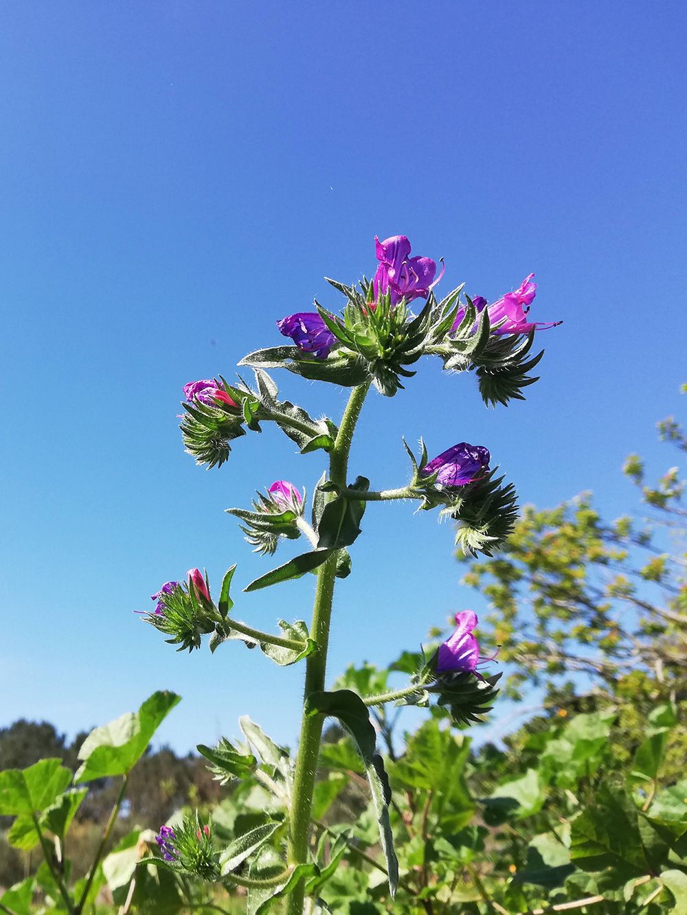 De plant op de foto wordt door Google herkend als Echium Sabulicola, de Nederlandse naam is Slangenkruid, maar de soort die in Nederland voorkomt is Echium Vulgare, die heeft wat kleinere bloemen dan deze. Sabulicola betekent niet veel meer dan dat het op zandgrond leeft. Daarom wel erg opvallend dat de plant alleen groeit op de stukken terrein waar we vorig jaar de grond gestort hebben die van het terras afkomt. Slim hoor van die planten dat ze dat zo gauw weten te vinden!